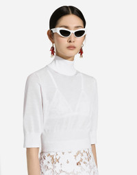 The Italian summers of the 1960s, the candid purity of white, the sophisticated elegance of the jet set of that era. The imagery of the FW24/25 Capri Collection encapsulates all this flawlessly. The pieces range from floaty poplin silhouettes or sack-style dresses and skirts, to brocade outerwear and floral-inlay fabric shirts. The iconic bags – the Logo Bag, the Sicily Bag and the Dolce Box – complement the looks, while the shoes come embroidered with designs inspired by the crystal-clear sea of Capri. Creole earrings with horn, coral branches and pearls: • Gold • Rhinestone-adorned horn • Acrylic glass spheres • Hoop fastening • Height: 6.5 cm • Nickel-free and hypoallergenic materials • Engraved logo • Made in Italy External composition: 20% Steel 30% Brass 40% Acrylic Glass 10% Glass
