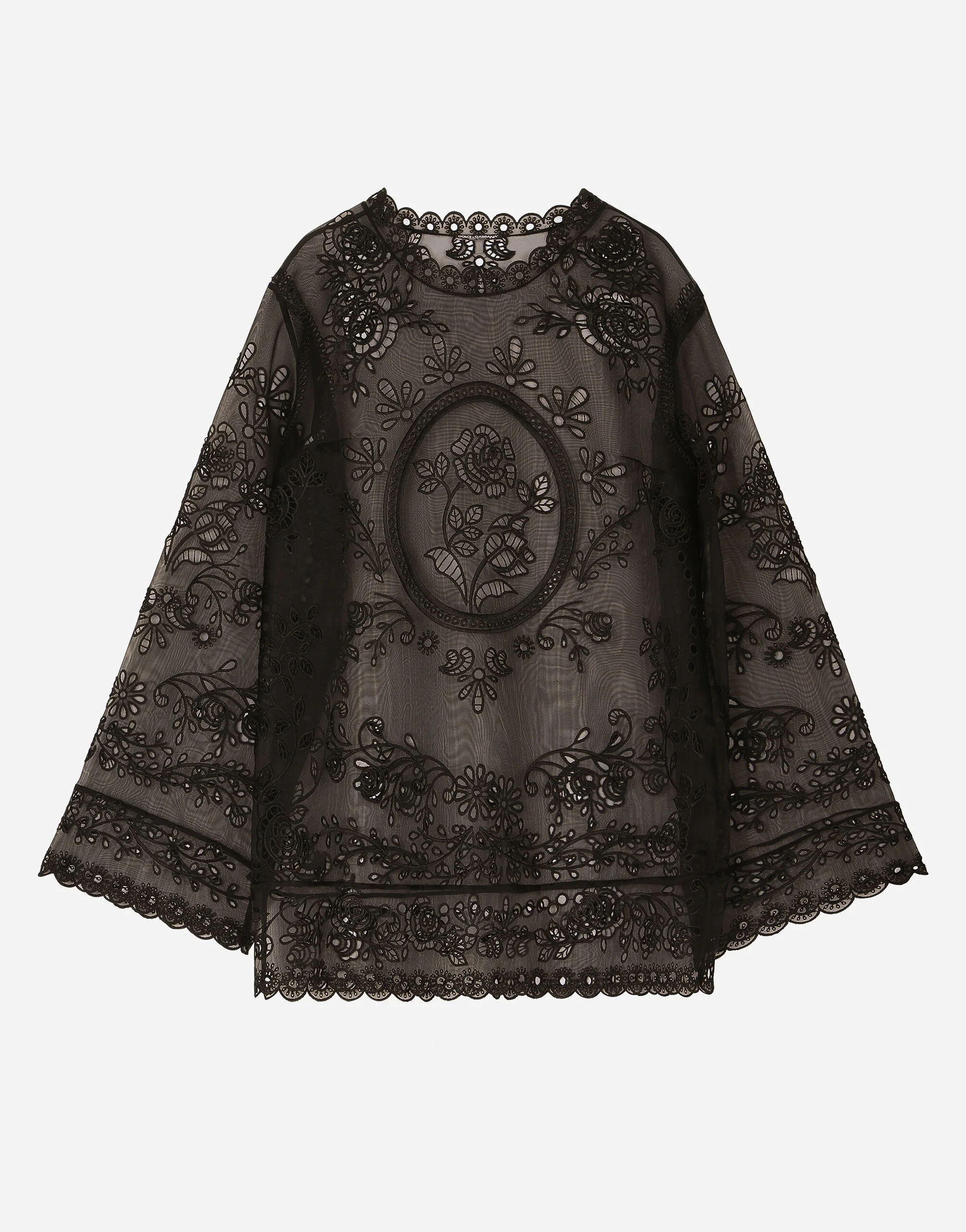 Crinoline A-line dress with inlay embellishment: • Black • Round neck • Full long sleeves • Stretch silk slip • The piece measures 45 cm from the waist down on a size IT 40 • The model is 175 cm tall and wears a size IT 40 • Made in Italy Care And Details External composition: 90% Polyamide 10% Polyester Internal composition: 91% Silk 9% Spandex