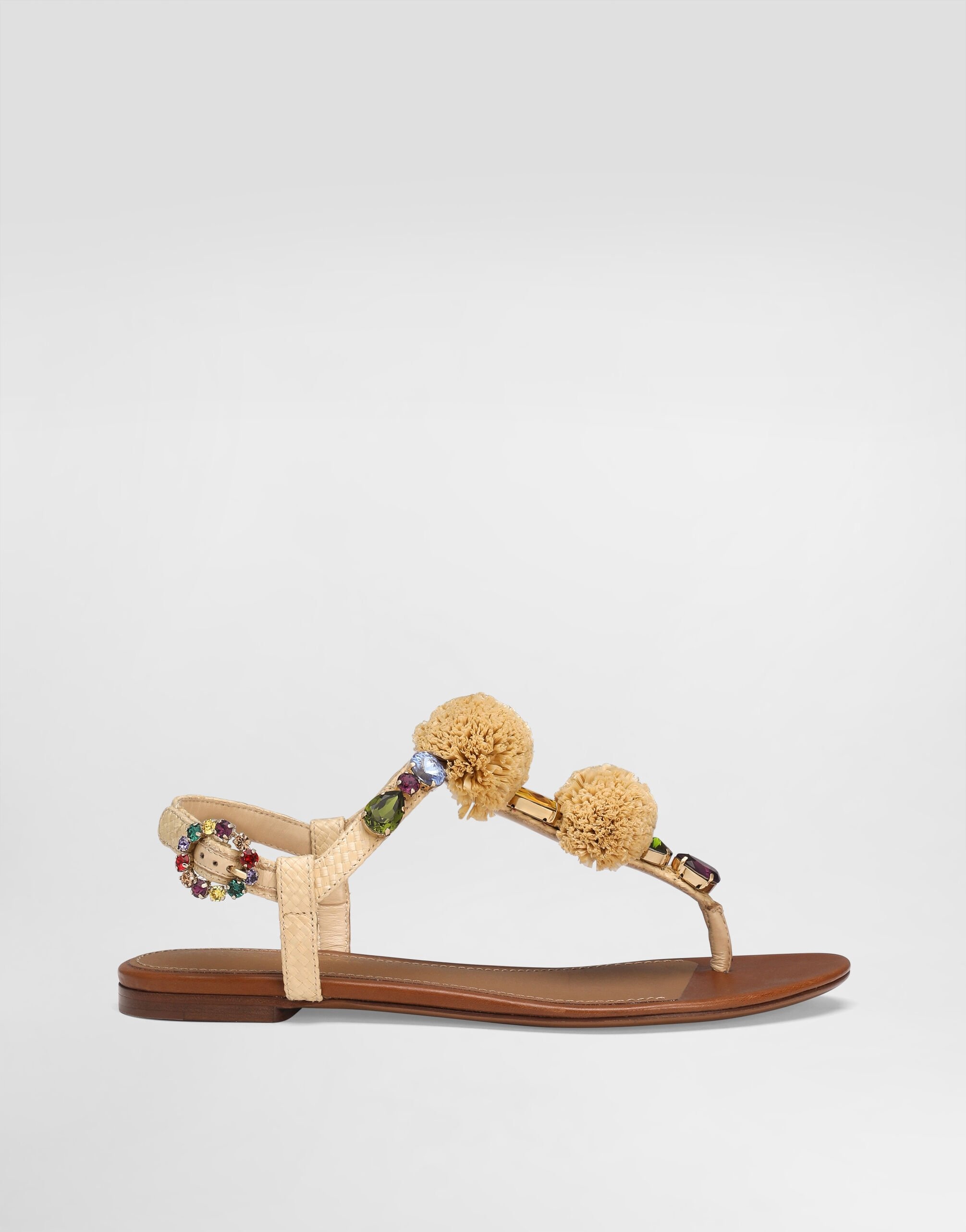 This flip-flop combines elegance and craftsmanship, with embroidered details and stones that add a touch of luxury to the formal design. Flip flops in rafia crochet with stones: • Multi-coloured • Leather sole with DG logo • Leather open toe insole • Jewel buckle and embroidery with stones • DG gold electroplating • Item equipped with black cotton bag and black embossed box • Made in Italy External Composition: 85% Viscose, 15% Cotton Internal Composition: 71% Calfskin, 29% Goat leather