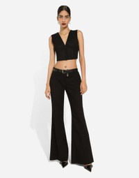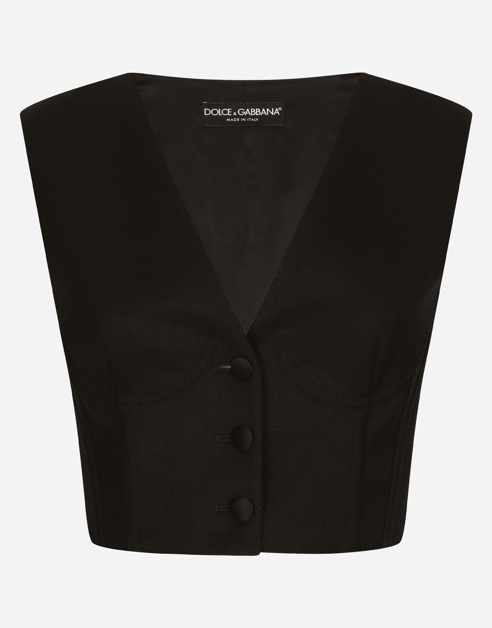 In the Black Sicily Collection, black, the absolute protagonist, becomes sensual black, sheer black, Dolce&Gabbana black. The key concept is “Black on Black”. Playing around with proportions, volumes, layered fabrics and sheer details, this style becomes absolute, bold and sexy. Unique and unmistakable, it is conveyed through the contrasts between glossy and matte fabrics, lines, volumes and special details, thereby expressing a woman’s various personalities and the true identity of Dolce&Gabbana. Cropped stretch cady waistcoat with corset details: • Black • V-neck • Single-breasted • Front boning • Underwired cups • Form fitting • Stretch silk satin lining • Button fastenings • The piece measures 37 cm from the center back on a size IT 40 • The model is 175 cm tall and wears a size IT 40 • Made in Italy External composition: 37% Silk 37% Cotton 22% Viscose 4% Spandex Internal composition: 92% Silk 8% Spandex
