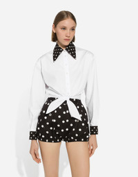 The FW24/25 Mambo Collection is rewriting the rules of Italian elegance, merging the sophisticated style of the 1940s and 1950s with the iconography of American pin-ups. The unmistakable polka-dot motif takes center stage, coming in a variety of shapes and sizes and adorning tulle, charmeuse, twill, silk and poplin, giving life to looks distinguished by black and white accessories and details. An homage to the beauty of Italy and its traditions, the distinctive details of Dolce&Gabbana’s creations. Cropped cotton poplin shirt with knot detail and polka-dot print: • White • Shirt collar • Long sleeves • Cropped fit • Button fastenings and knotted waist • The piece measures 45 cm from the back of the neck on a size IT 40 • The model is 175 cm tall and wears a size IT 40 • Made in Italy External composition: 100% Cotton