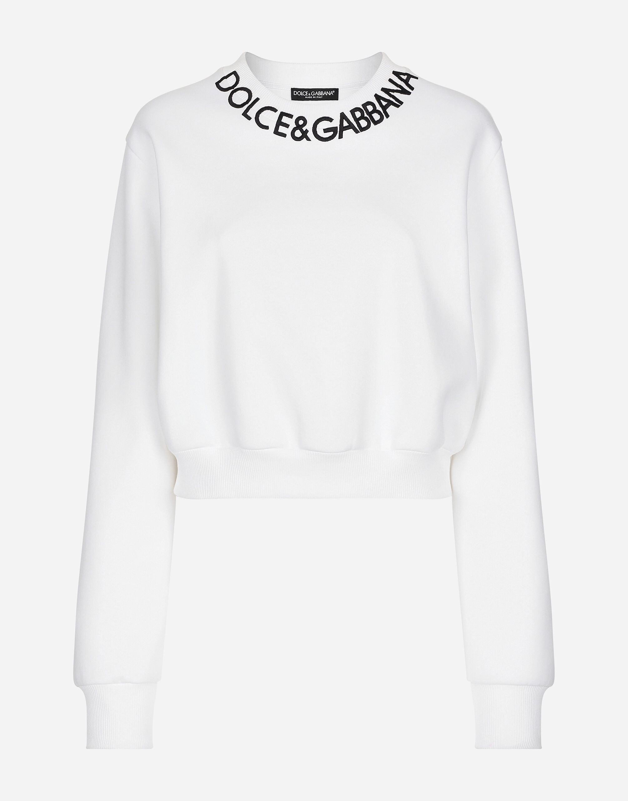 The absolute star of the new “Black Sicily” collection is black, the color of immortal elegance that encapsulates the most diverse facets of Dolce&Gabbana. The new black is not only rebellion, but also elegance, austerity and rigor, timeless in its absolute strength, it makes all looks even more attractive, seductive and sophisticated, Sicily black thus becomes the symbol of absolute beauty. Cropped jersey sweatshirt with logo embroidery on neck: • White • Round neck • Long sleeves • Cropped fit • Jersey trims • The piece measures 49 cm from the rear collar seam on a size IT 40 • The model is 175 cm tall and wears a size IT 40 • Made in Italy External composition: 71% Cotton 29% Polyester