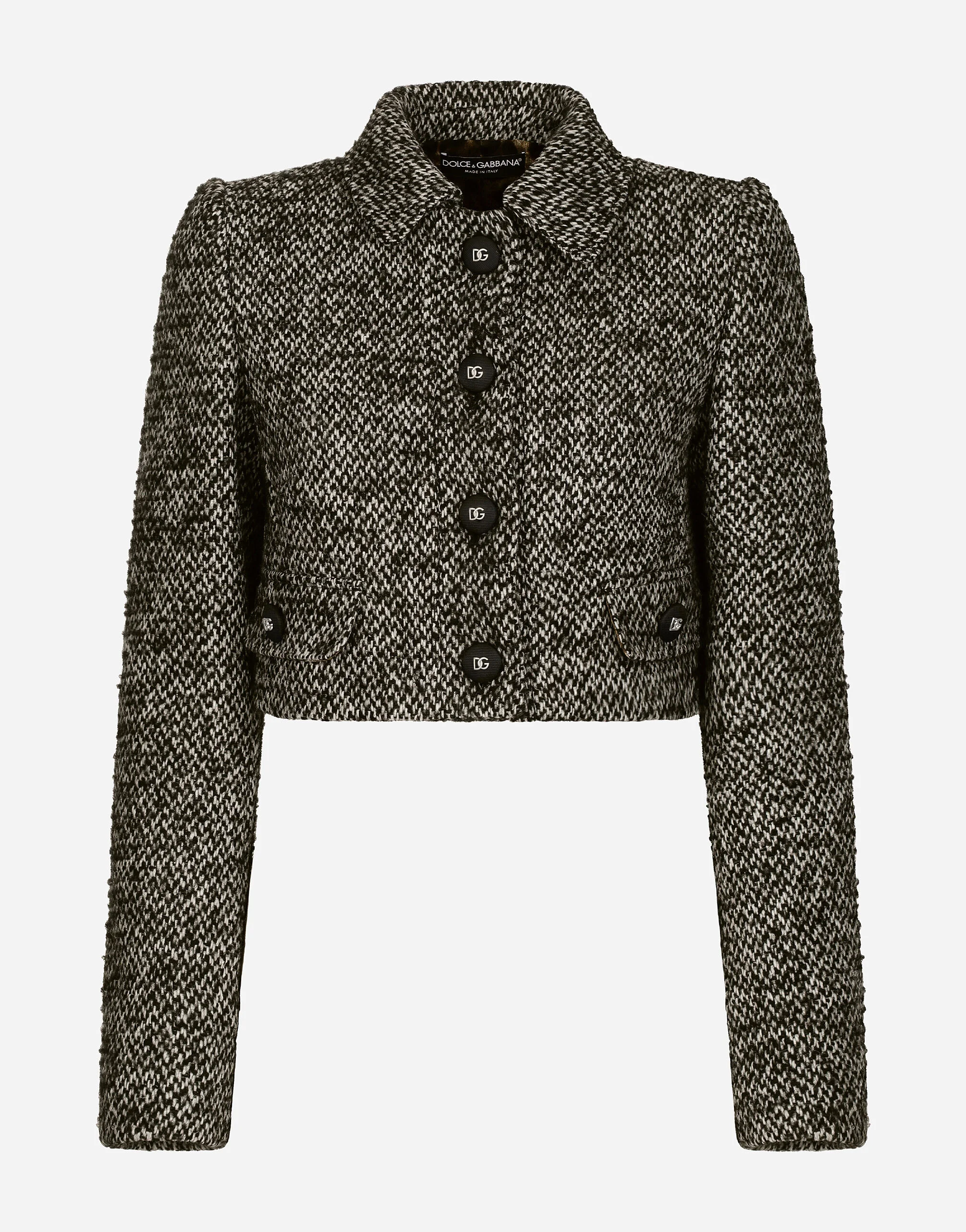 • Shirt collar • Long sleeves • Flap pockets • Leopard-print stretch satin lining • Canneté-covered button fastenings and DG logo • The piece measures 39.5 cm from the rear collar seam on a size IT 40 • The model is 175 cm tall and wears a size IT 40 • Made in Italy Care And Details External composition: 60% Wool 20% Acrylic 9% Polyester 4% Alpaca 4% Other Fibers 3% Polyamide Internal composition: 97% Polyester 3% Spandex
