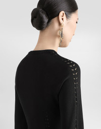 The Spring/Summer 2025 Women’s Collection is celebrating Italian beauty through bold and charismatic femininity. The 50s-inspired lingerie is the star, intermingling with fitted dresses, corsets and oversize trench coats. The iconic jackets have been updated with cropped cuts and modern inserts, while the floral prints add a romantic edge. The eveningwear shines with light fabrics and crystals, accompanied by look-defining accessories, from iconic bags to the cross earrings. Cropped viscose sweater with stitch work: • Black • 18-gauge knit • Round neck • Long sleeves • Ribbed trim • Raglan cuts • Slim fit • The piece measures 42 cm from the shoulder seam on a size IT 40 • The model is 175 cm tall and wears a size IT 40 • Made in Italy External composition: 79% Viscose 13% Polyamide 8% Polyester
