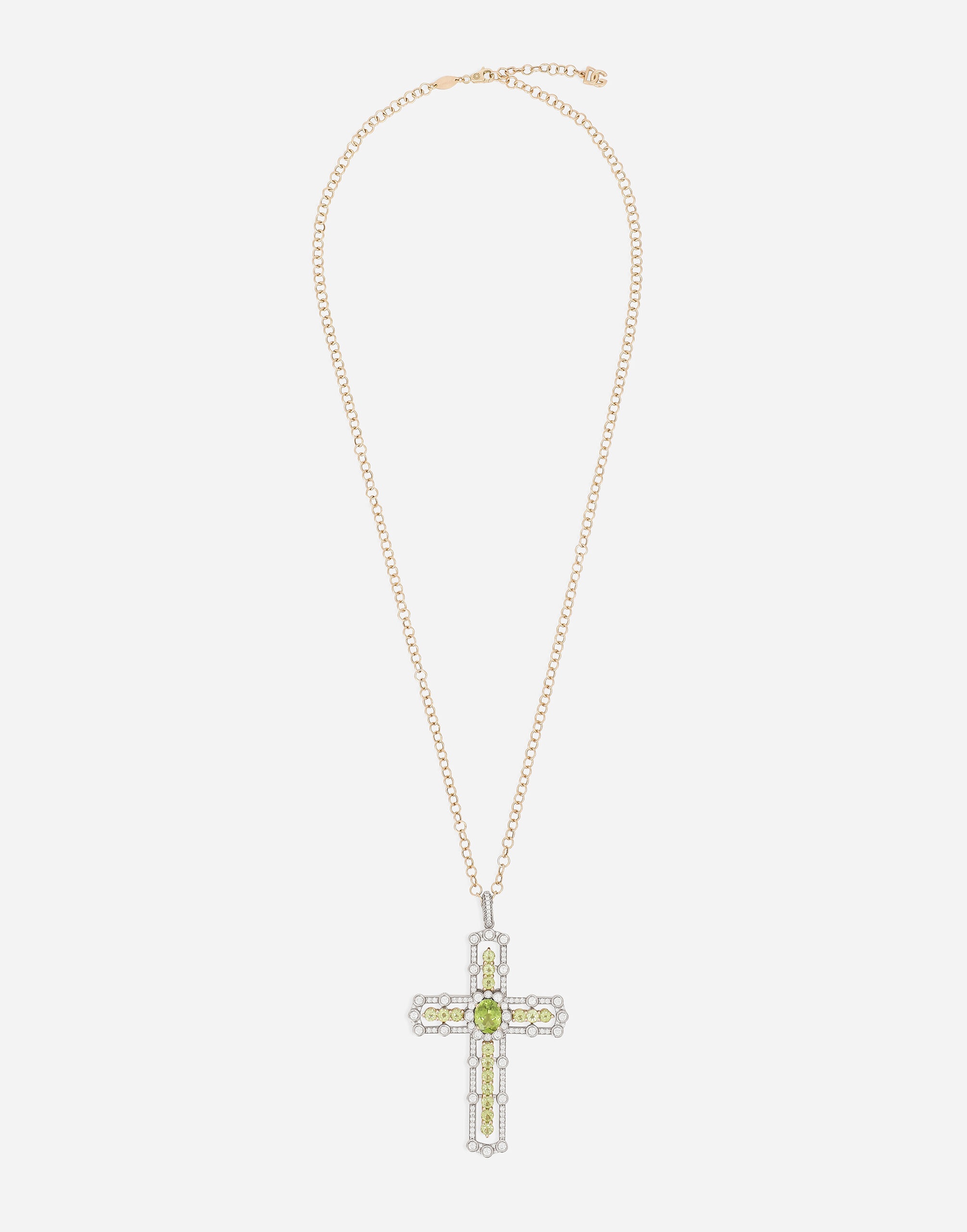 Yellow and white gold cross pendant with peridots and diamonds. Technical features: 18 Kt yellow and white gold Length: 60 cm Cross size: 7 cm Gems: 16 peridots: transparent, yellowish green color, round shape, brilliant cut Made in Italy rose gold, yellow gold