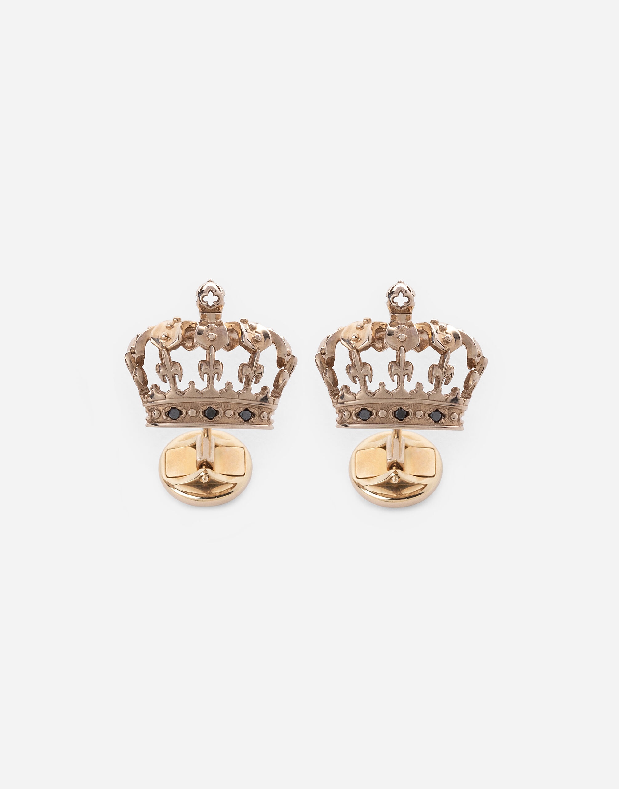 These original crown-shaped white gold cufflinks boast six black diamonds set in the base. All Dolce&Gabbana cufflinks feature a unique closure, with a rose-cut ruby and an embossed logo. Technical specifications: Gold 18 Kt. Gemstones: 6 round black diamonds, 2 rose-cut rubies. White 18 kt gold