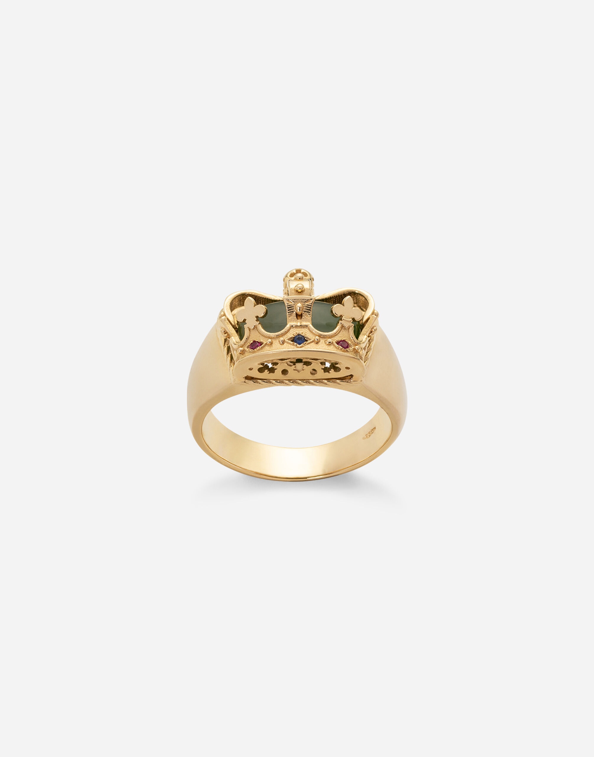 This yellow gold ring features a crown with a green jade cushion, two rubies and one blue sapphire are set into the base. The DOLCE&GABBANA logo is carved inside in the center. Technical specifications. • Gold 18 Kt. • Gemstones. 1 cabochon green jade, 1 round blue sapphire, 2 round rubies. • Made in Italy. External composition: Yellow 18 kt Gold