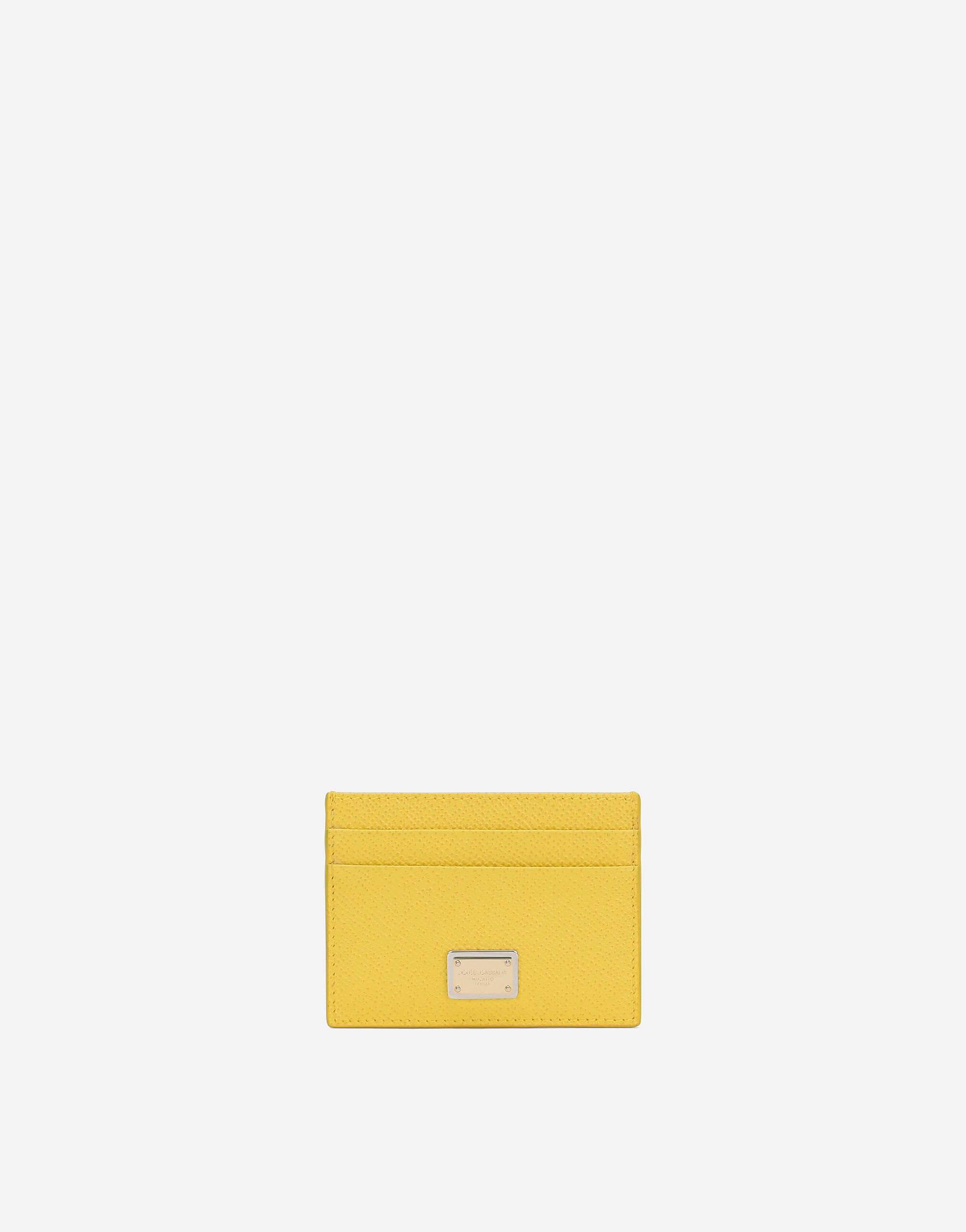 Practical and understated, this card holder comes in Dauphine calfskin. Perfect for carrying in your pocket or smaller bags, it features the branded plate with two metal electroplated finishes. Dauphine calfskin card holder with branded tag: • Yellow • Four front card slots and one on top • Measurements: H7.5 x W10 x D0.5 cm • Made in Italy External composition: 100% Calfskin Internal composition: 100% Viscose