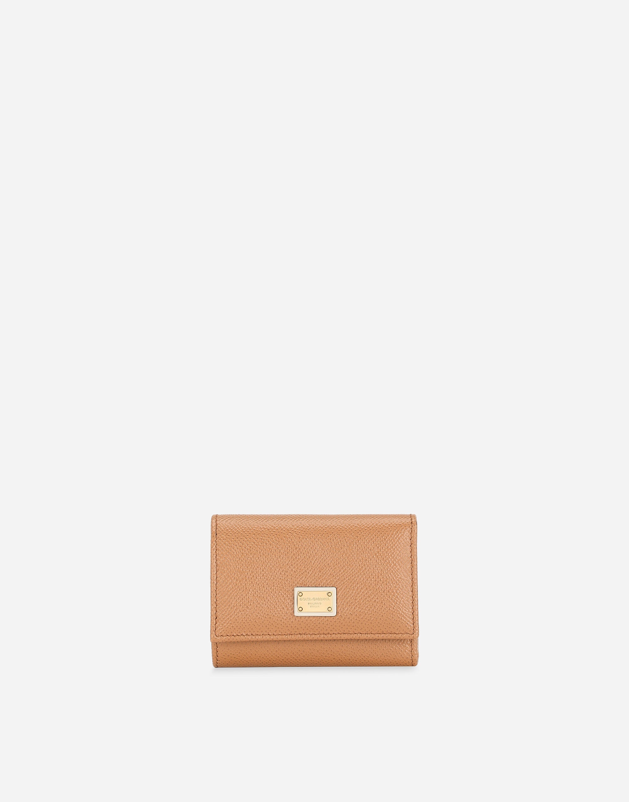 Practical and compact, this Dauphine calfskin French flap wallet features the logo tag featuring two metal plating finishes. Its small size means it is perfect for the smallest bags. Dauphine calfskin French-flap wallet with branded tag: • Brown • Front flap with logo tag and a hidden press-stud fastening • Four card slots • One bill compartment • Rear coin pocket with zipper • Measurements: H8.5 x W10.7 x P3 cm • Made in Italy External composition: 100% Calfskin Internal composition: 90% Calfskin 10% Viscose