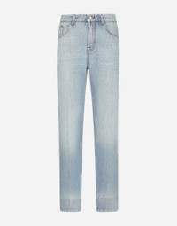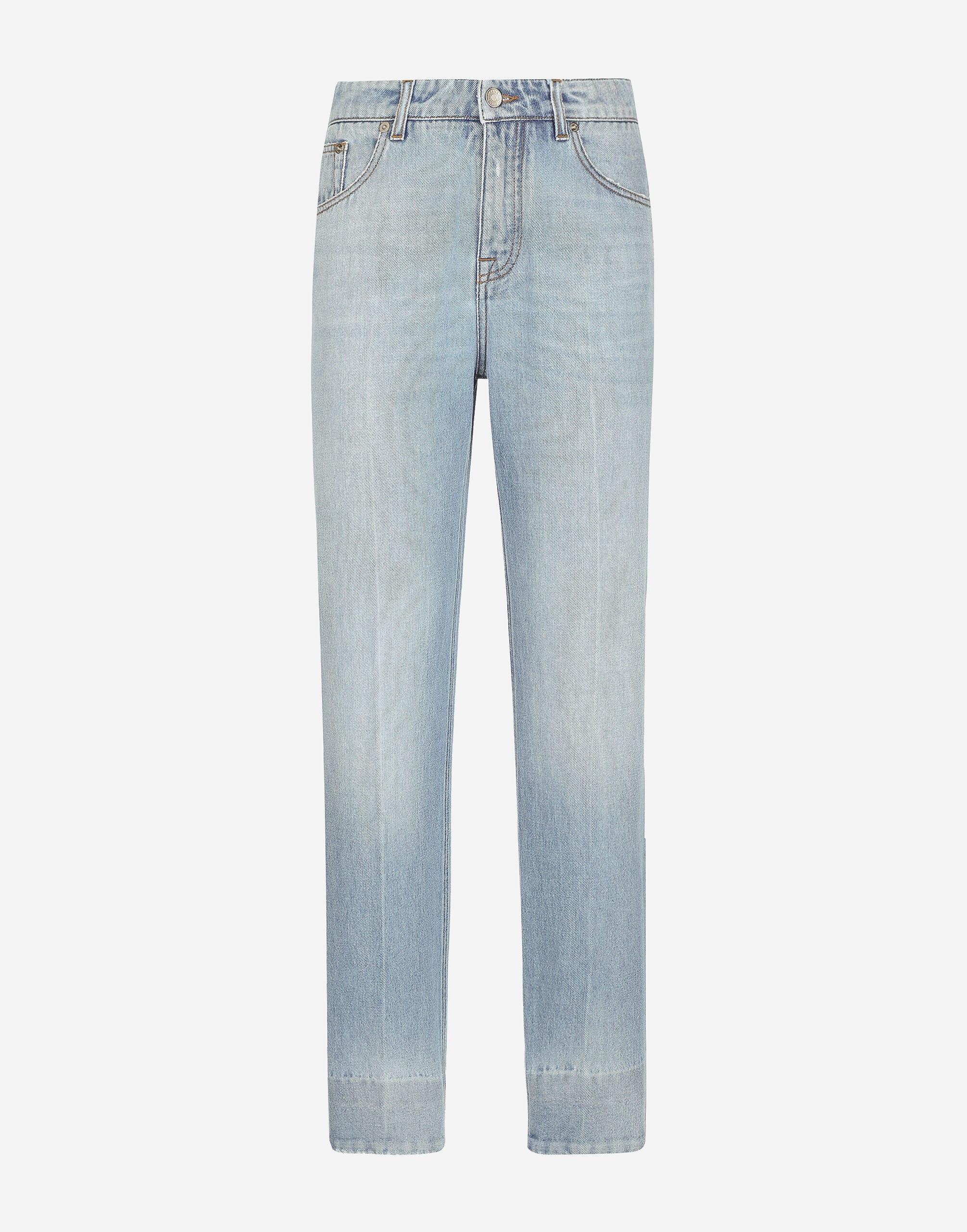 The spirit of the 1960s is taking over the new Flower Power collection. The focus is a head-to-toe floral look built around pairing and layering rose, anemone and floral bouquet maxi-prints. A cosmopolite poised between playful and sexy, this woman interprets the austerity and elegance of the 1960s, harking back to boldly opulent imagery that here at Dolce&Gabbana is condensed and reinterpreted through silhouettes, ample proportions and airy shapes, bringing femininity and sensuality to the forefront. Cotton denim jeans: • Blue • Regular rise • 5 pockets • Branded metal and leather tag • Branded label on the coin pocket • Inner leg: 78 cm • Hem: 18.5 cm • Zipper and branded metal button fastening • The model is 175 cm tall and wears a size IT 40 • Made in Italy External composition: 100% Cotton