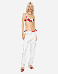 The Flowering Collection has us dreaming of faraway destinations, the most exclusive ones in the world, inviting us through the colors and the yellow rose print to take refuge in warm and unique places. Light White, lemon yellow, polka-dot accents and the various shades of leaf green for vibrant and ultra-feminine pieces where the keyword is tailoring. Every look invites us to savor and dream every moment of our free time, to discover beauty and enhance our femininity. Jeans: • White • Regular rise • 5 pockets • Branded metal and leather tag • Branded label on the coin pocket • Inner leg: 77 cm • Hem: 16.5 cm • Zipper and branded metal button fastening • The model is 175 cm tall and wears a size IT 40 • Made in Italy External composition: 98% Cotton 2% Spandex