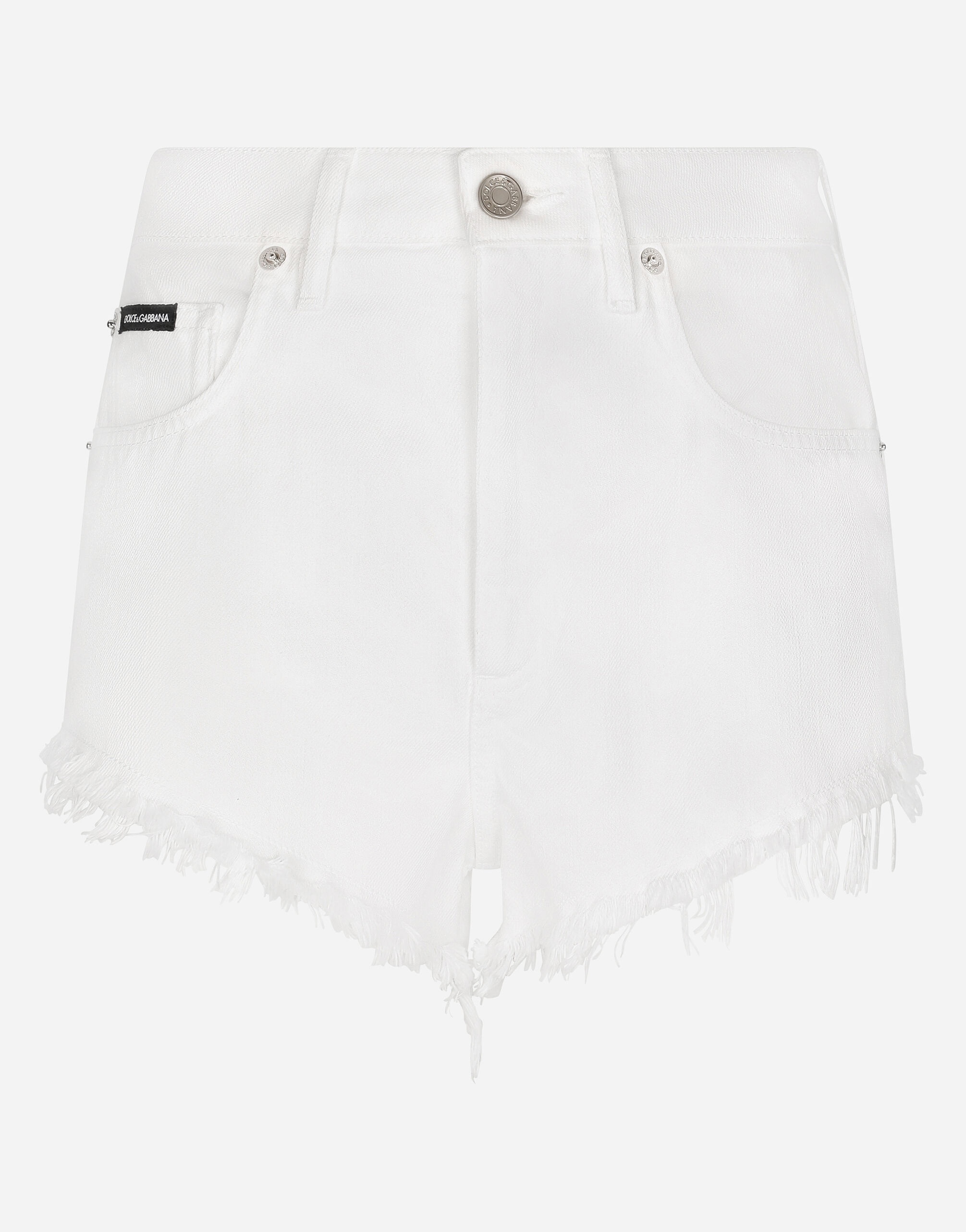 The Flowering Collection has us dreaming of faraway destinations, the most exclusive ones in the world, inviting us through the colors and the yellow rose print to take refuge in warm and unique places. Light White, lemon yellow, polka-dot accents and the various shades of leaf green for vibrant and ultra-feminine pieces where the keyword is tailoring. Every look invites us to savor and dream every moment of our free time, to discover beauty and enhance our femininity. Cotton denim shorts with ripped details and abrasions: • White • Regular rise • 5 pockets • Branded metal and leather tag • Branded label on the coin pocket • Inner leg: 3 cm • Hem: 23 cm • Zipper and branded metal button fastening • The model is 175 cm tall and wears a size IT 40 • Made in Italy External composition: 98% Cotton 2% Spandex