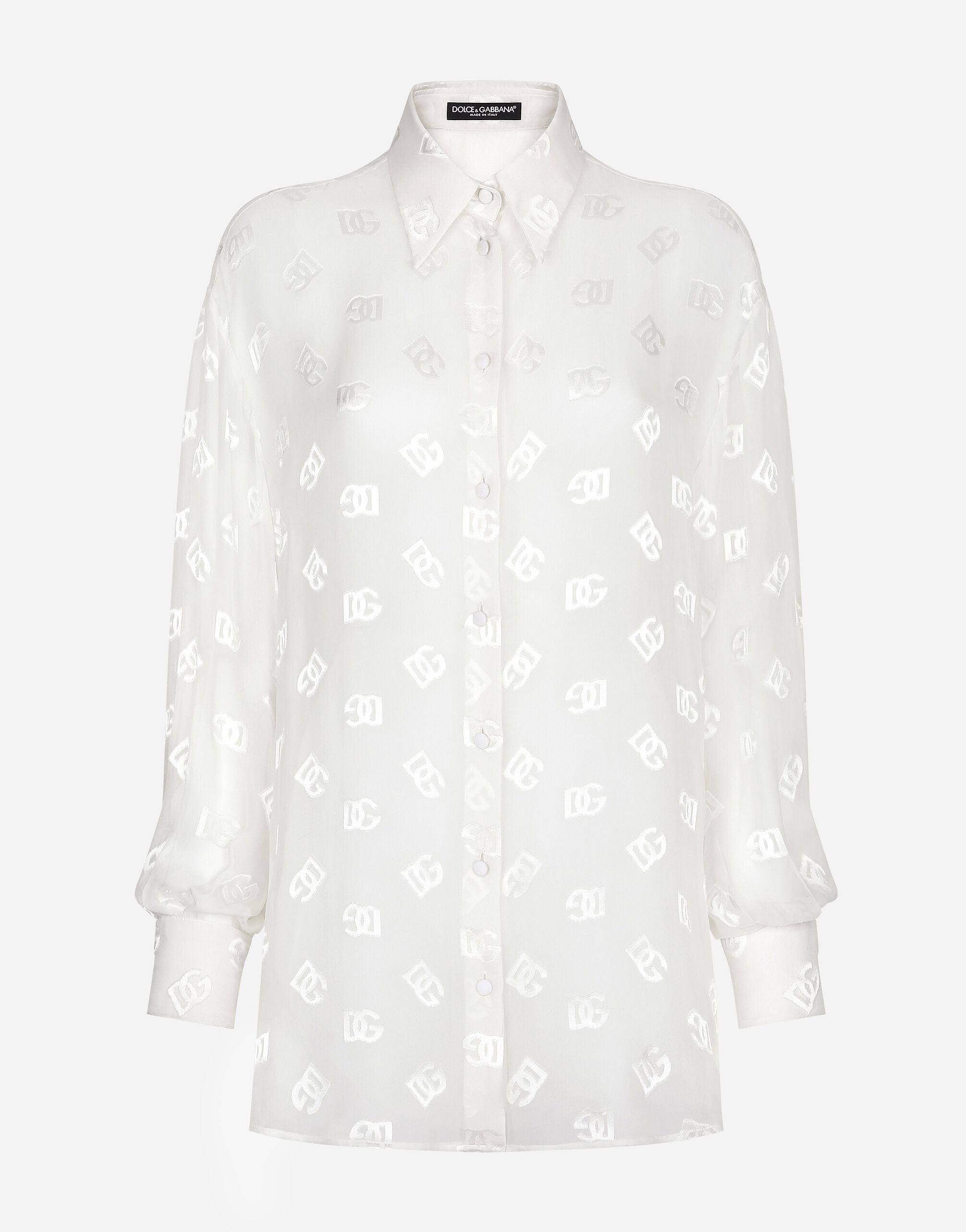 The DNA collection is distinguished by timeless shapes, bringing together three concepts: Sicilian flair, tailoring and sensuality. Nero Sicilia black and optical white predominate and pair with colors that catapult us onto the island of Sicily and make us dream. The designers channel the timeless wardrobe made up of creations that are instantly unmistakable in their simplicity, presenting us with sophisticated beauty loaded with meaning and symbolism that transcends fashion. Dévoré silk satin shirt with DG logo: • White • Shirt collar • Long sleeves • Regular fit • Button fastenings with branded bottom edge • The piece measures 77 cm from the rear collar seam on a size IT 40 • The model is tall • Made in Italy External composition: 60% Viscose 40% Silk
