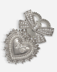 Earrings in 18 kt white gold featuring an elegant bow and the magnificent Sacred Heart, symbol of unconditional love and faith, both enriched with diamonds. The DG logo is engraved inside the heart. Technical specifications. • Gold 18 Kt. • Gemstones. pcs 176 colourless diamonds ( 0,45 ct* ). • Made in Italy *The weight of the stones is an average value provided for reference purposes only. White 18 kt Gold