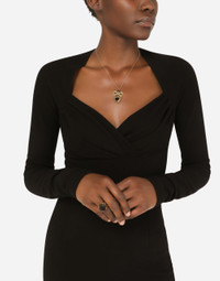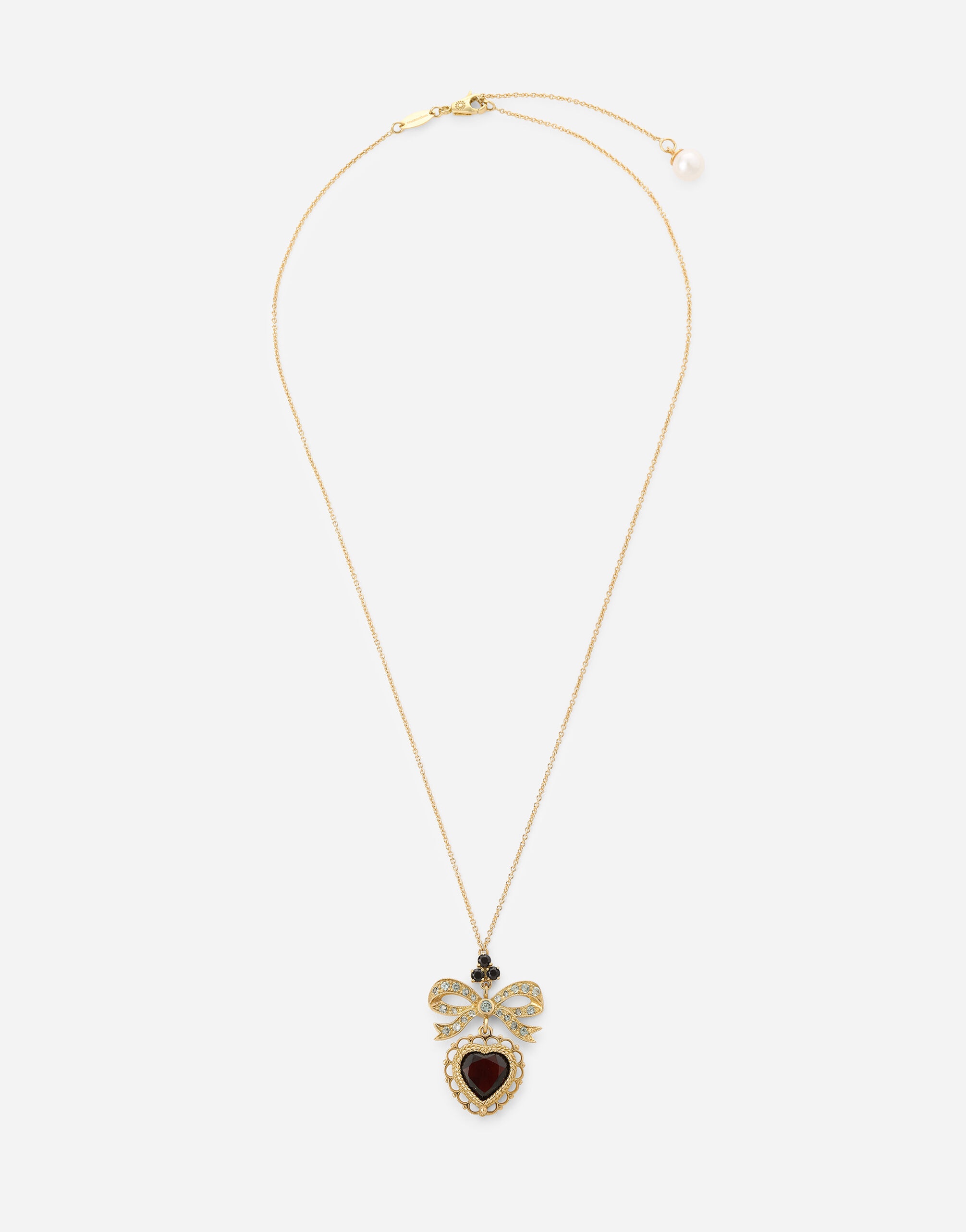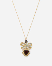The necklace consists of a thin "rolo" chain and a pendant made of a romantic bow set with gray sapphires and a red rhodolite garnet heart set in a frame that recalls the delicate craftsmanship of lace. A clover of black sapphires connects the pendant to the necklace. A spherical pearl has been inserted as a terminal in the adjustment chain while an oval tag bearing the logo "DOLCE&GABBANA" is placed before the closure. Technical features: Gold 750/000. Length: 45 + 5 cm adjustable. Gems: 1 red heart garnet, 23 round gray sapphires, 3 round black sapphires, 1 spherical freshwater pearl. Made in Italy Yellow gold 750/000