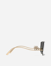 A new innovative and modern style for a sophisticated look. The metal temples are irregular and embellished with the iconic DG Crossed logo with beautiful rhinestones and luminous metal hemispheres. • Gold metal frame • Gold metal temples • Dark grey lenses • 100% UV protection • Size lens - bridge - temple: 44 - 144 - 145 mm • Fitting: Adjustable nosepads • Packaging: DG logo • Made in Italy