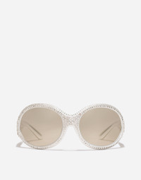 A mix of Sensuality and Strong Personality for this wrap-around oversize model, proposed offered in a luxurious version, embellished with sparkling strass on the front and temples, with the iconic DG logo crossed in silver. • Silver acetate frame with strass • Silver acetate temples with strass • silver mirror lenses • 100% UV protection • Size lens - bridge- temple: 67 - 21 - 115 mm • Fitting: Standard • Packaging: Istitutional • Made in Italy