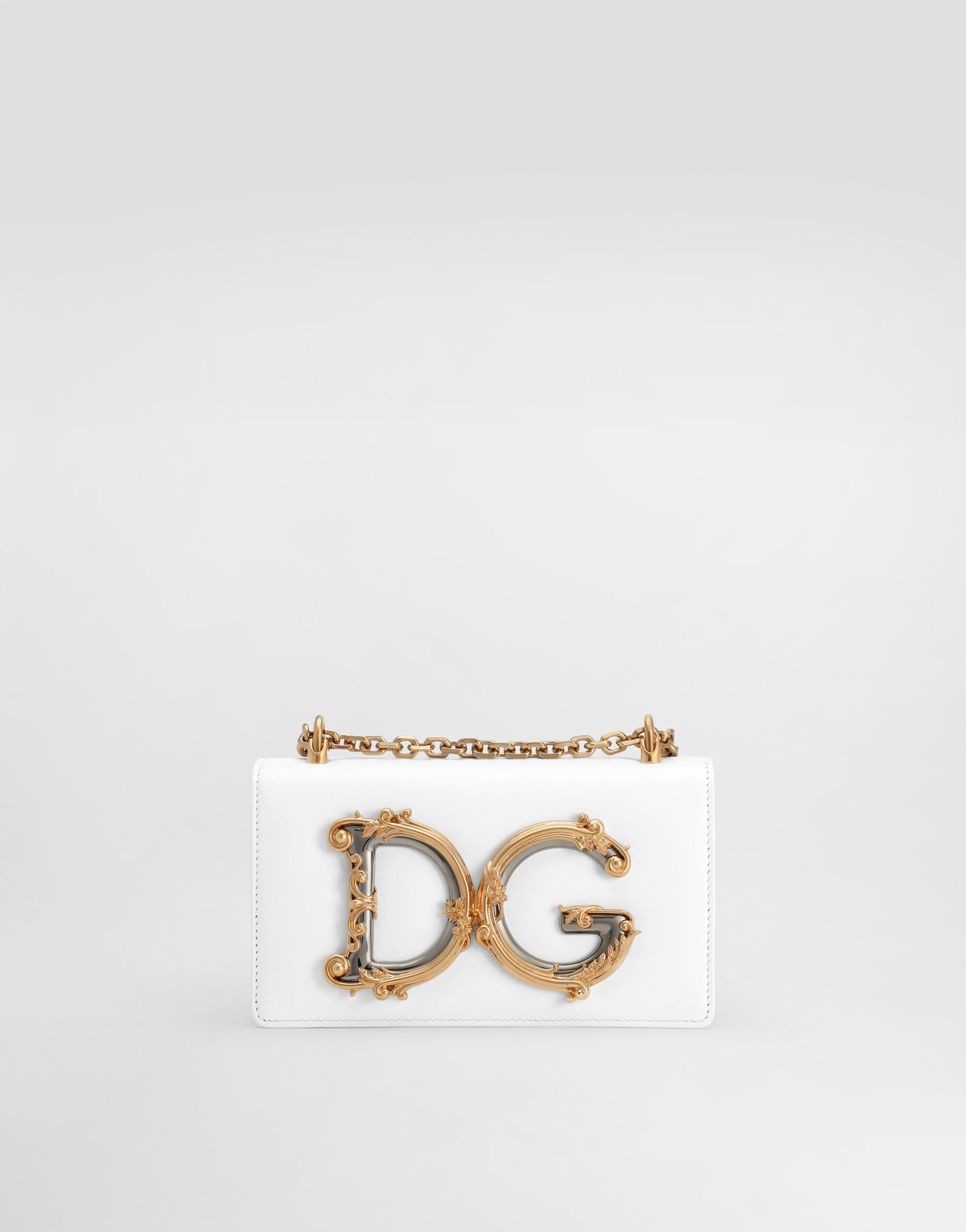 The DG Girls line, designed right down to the smallest detail, has become a phone bag. Understated and elegant, it comes in calfskin with the baroque DG logo on the front in enameled and amber-toned gold-plated ABS: • Adjustable chain strap • Front flap with DG logo • Hidden double magnetic fastenings • Calfskin lining • Item comes with a branded dust bag • Measurements: 10 x 17.8 x 3.5 cm - 3.9 x 7 x 1.4 inches • Made in Italy Care And Details External Composition: 100% Calfskin Internal Composition: 100% Calfskin