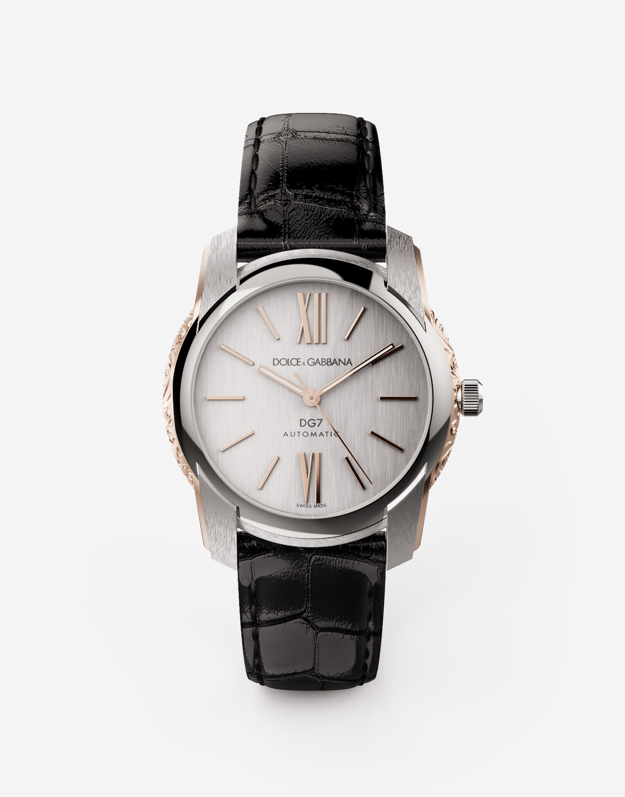 DG7 watch in steel with engraved side decoration in gold Technical specifications. • Functions. hour, minute and second hands • Case. 316L steel - Size. 40 mm diameter - Glass. convex “sapphire” glass - Back case. “sapphire” glass - Bottom clasp. clip-down with safety closure - Crown. 316L steel - Side decoration. 18 Kt pink gold, engraved by hand - Water resistance. 3BAR/3ATM • Dial. silver plated-plated and satin-finished - Markers. pink gold-plated - Hands. luminescent “baton” hands • Movement. self-winding mechanical movement with 42 hours power reserve - Calibre. ETA 2892.A2 Swiss Made - Size. diameter 25.60 mm, h 3.8 mm - Frequency of the escapement. 28.800 vibrations per hour (4Hz) - Number of rubies. 21 • Strap. black alligator - Clasp. snap closure in 316L steel with side buttons • Swiss Made External composition: 316L Steel and 18kt Red Gold POST-SELLING WATCHES MAINTENANCE To maintain the sheen of the watch and metal bracelet, we recommend using mild soap and rinsing thoroughly with warm water. Dry with a soft cloth. We recommend this being done also after a swim in the sea or pool. It is advisable to avoid direct contact with solvents, detergents, perfumes and cosmetic products, which might damage the case, seals, bracelet and/or strap. It is advisable to protect the watch from falls and shocks, which could not only seriously damage the finish, but might affect the mechanical functions also, as well as the water resistance and accuracy of the watch. Temperatures above 60° C and below -10° C , sudden changes in pressure, density and temperature, magnetic fields, and many other factors can affect the accuracy of the watch. If you note any irregularities in operation, the watch should be taken to an authorised Dolce&Gabbana retailer. The Dolce&Gabbana watch is a high-precision timepiece. Despite the care watchmakers have dedicated to making it, the influence of magnetic fields, sudden temperature change and even the lifestyle of the wearer may result in minor irregularities. To ensure optimal operation, it is recommended that a comprehensive inspection be effected every three or four years. The owners of the watch can benefit from a global network of Dolce&Gabbana retailers, which alone are authorised to carry out operations on the watch. In the same way, for the electronic quartz movement, it is recommended that the battery be replaced by an authorised Dolce&Gabbana retailer, which will at the same time check the proper functioning and water resistance of the watch. During maintenance, the battery and any electrical parts are collected and disposed of in accordance with current regulations.