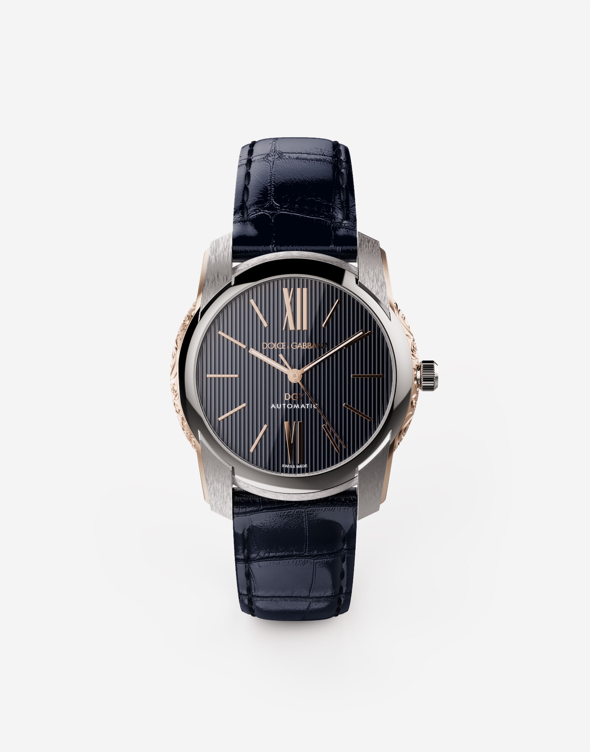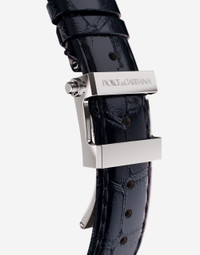 DG7 watch in steel with engraved side decoration in gold Technical specifications. • Functions. hour, minute and second hands • Case. 316L steel - Size. 40 mm diameter - Glass. convex “sapphire” glass - Back case. “sapphire” glass - Bottom clasp. clip-down with safety closure - Crown. 316L steel - Side decoration. 18 Kt pink gold, engraved by hand - Water resistance. 3BAR/3ATM • Dial. pyjama collection blue enamelled - Markers. pink gold-plated - Hands. luminescent “baton” hands • Movement. self-winding mechanical movement with 42 hours power reserve - Calibre. ETA 2892.A2 Swiss Made - Size. diameter 25.60 mm, h 3.8 mm - Frequency of the escapement. 28.800 vibrations per hour (4Hz) - Number of rubies. 21 • Strap. pyjama collection blue alligator - Clasp. snap closure in 316L steel with side buttons • Swiss Made External composition: 316L Steel and 18kt Red Gold POST-SELLING WATCHES MAINTENANCE To maintain the sheen of the watch and metal bracelet, we recommend using mild soap and rinsing thoroughly with warm water. Dry with a soft cloth. We recommend this being done also after a swim in the sea or pool. It is advisable to avoid direct contact with solvents, detergents, perfumes and cosmetic products, which might damage the case, seals, bracelet and/or strap. It is advisable to protect the watch from falls and shocks, which could not only seriously damage the finish, but might affect the mechanical functions also, as well as the water resistance and accuracy of the watch. Temperatures above 60° C and below -10° C , sudden changes in pressure, density and temperature, magnetic fields, and many other factors can affect the accuracy of the watch. If you note any irregularities in operation, the watch should be taken to an authorised Dolce&Gabbana retailer. The Dolce&Gabbana watch is a high-precision timepiece. Despite the care watchmakers have dedicated to making it, the influence of magnetic fields, sudden temperature change and even the lifestyle of the wearer may result in minor irregularities. To ensure optimal operation, it is recommended that a comprehensive inspection be effected every three or four years. The owners of the watch can benefit from a global network of Dolce&Gabbana retailers, which alone are authorised to carry out operations on the watch. In the same way, for the electronic quartz movement, it is recommended that the battery be replaced by an authorised Dolce&Gabbana retailer, which will at the same time check the proper functioning and water resistance of the watch. During maintenance, the battery and any electrical parts are collected and disposed of in accordance with current regulations.