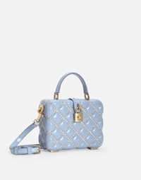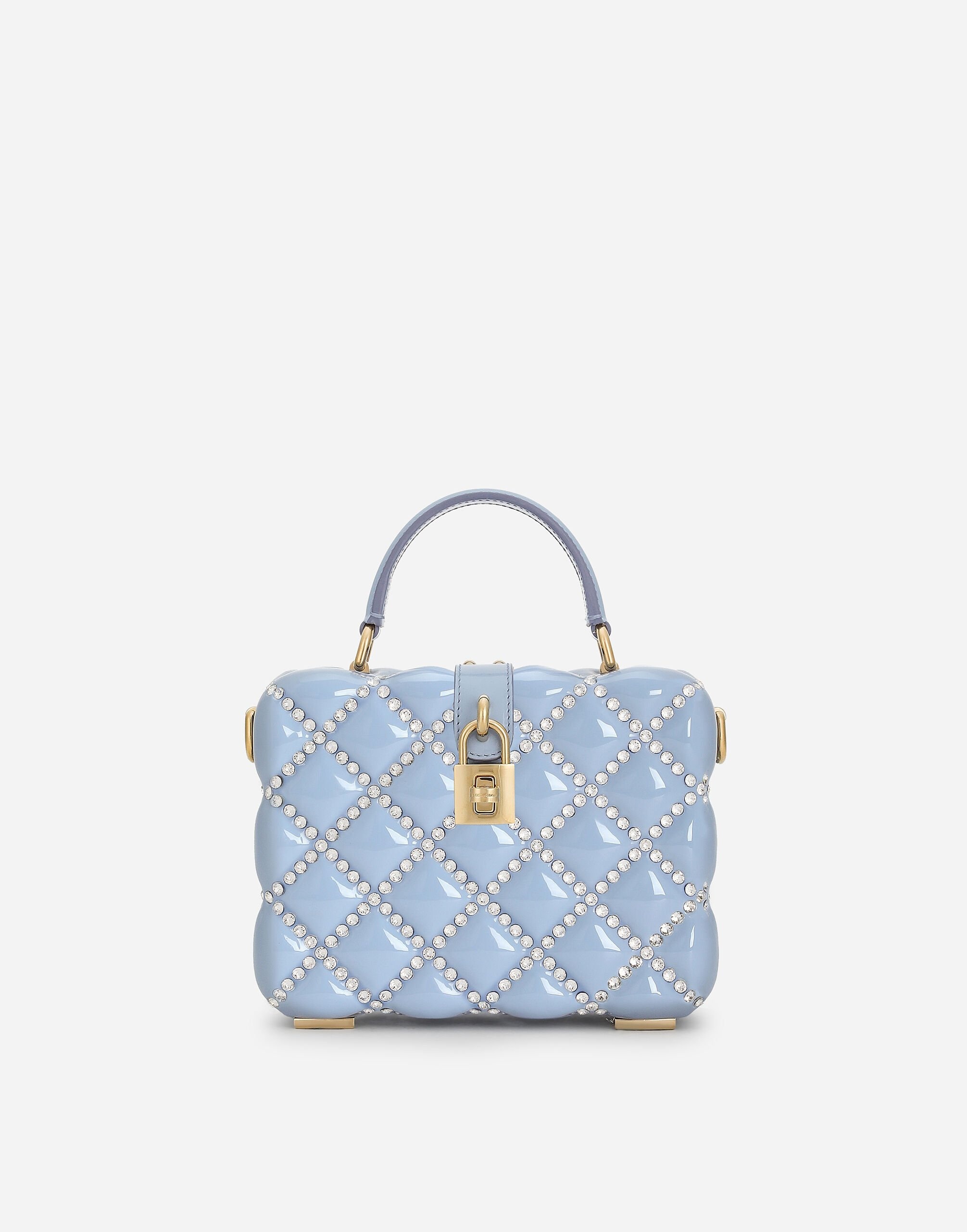 A brand icon, the Dolce Box bag embodies the brand’s craftsmanship, love and attention to detail. Fine and elegant, it comes in quilted-effect resin with rhinestone appliqués. Resin Dolce Box bag with rhinestones: • Light blue • Padlock fastening in light gold-plated metal with enamel flower embellishment • Top handle and adjustable, detachable strap in polished calfskin • Calfskin lining and inner pocket with concealed magnetic closure • Item comes with a branded dust bag • Measurements: H14.5 x W19 x D7 cm • Made in Italy External composition: 85% Polylactic Acid 15% Calfskin Internal composition: 100% Calfskin