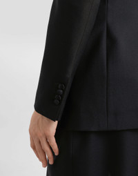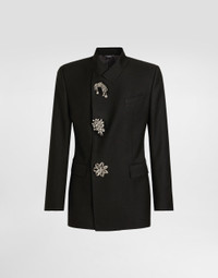 The scene is set for Dolce&Gabbana's distinctive and iconic aesthetic codes in the Collection from Men's Fall/Winter 2025 Fashion Show. The evening lights up with radiant brooches and is enriched with classic suits and blazers of timeless elegance. This double-breasted jacket is an example of timeless elegance, perfect for the modern man who appreciates refined style and refined details. Double-breasted jacket in wool gabardine: • Black • Sicilia shape • Rounded lapels • Double-breasted closed with poussoirs • Precious brooches on the front • Lined and canvassed • The model is 185 cm tall and wears a size 48 IT • Made in Italy External Composition: 100% Wool Internal Composition: 100% Silk