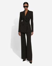 In the Black Sicily Collection, black, the absolute protagonist, becomes sensual black, sheer black, Dolce&Gabbana black. The key concept is “Black on Black”. Playing around with proportions, volumes, layered fabrics and sheer details, this style becomes absolute, bold and sexy. Unique and unmistakable, it is conveyed through the contrasts between glossy and matte fabrics, lines, volumes and special details, thereby expressing a woman’s various personalities and the true identity of Dolce&Gabbana. Double-breasted pinstripe wool Turlington jacket: • Black • Peak lapels • Long sleeves • Flap pockets • Stretch silk satin lining • Covered button fastenings • The piece measures 71 cm from the center back on a size IT 40 • The model is 175 cm tall and wears a size IT 40 • Made in Italy External composition: 100% Virgin Wool Internal composition: 92% Silk 8% Spandex