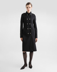 The Women's Black Sicily Collection reinforces Dolce&Gabbana's iconic fabrics and codes rooted in Italian heritage. Sensual silhouettes, highlighted by floral prints and refined corsetry, evoke an intriguing elegance, while the iconic black lace, satin, and velvet dominate the collection. Denim in various shades of blue introduces a contemporary twist, balancing the classic and modern. Embroidered crosses, medals, and jewelry add a sophisticated touch. Double-breasted stretch wool coat with bejeweled buttons: • Black • Baby collar • Long sleeves • Welt pockets • Stretch silk satin lining • Cannete-covered button fastenings and DG logo • The piece measures 121 cm from the center back on a size IT 40 • The model is 175 cm tall and wears a size IT 40 • Made in Italy External composition: 98% Virgin Wool 02% Spandex Internal composition: 92% Silk 08% Spandex