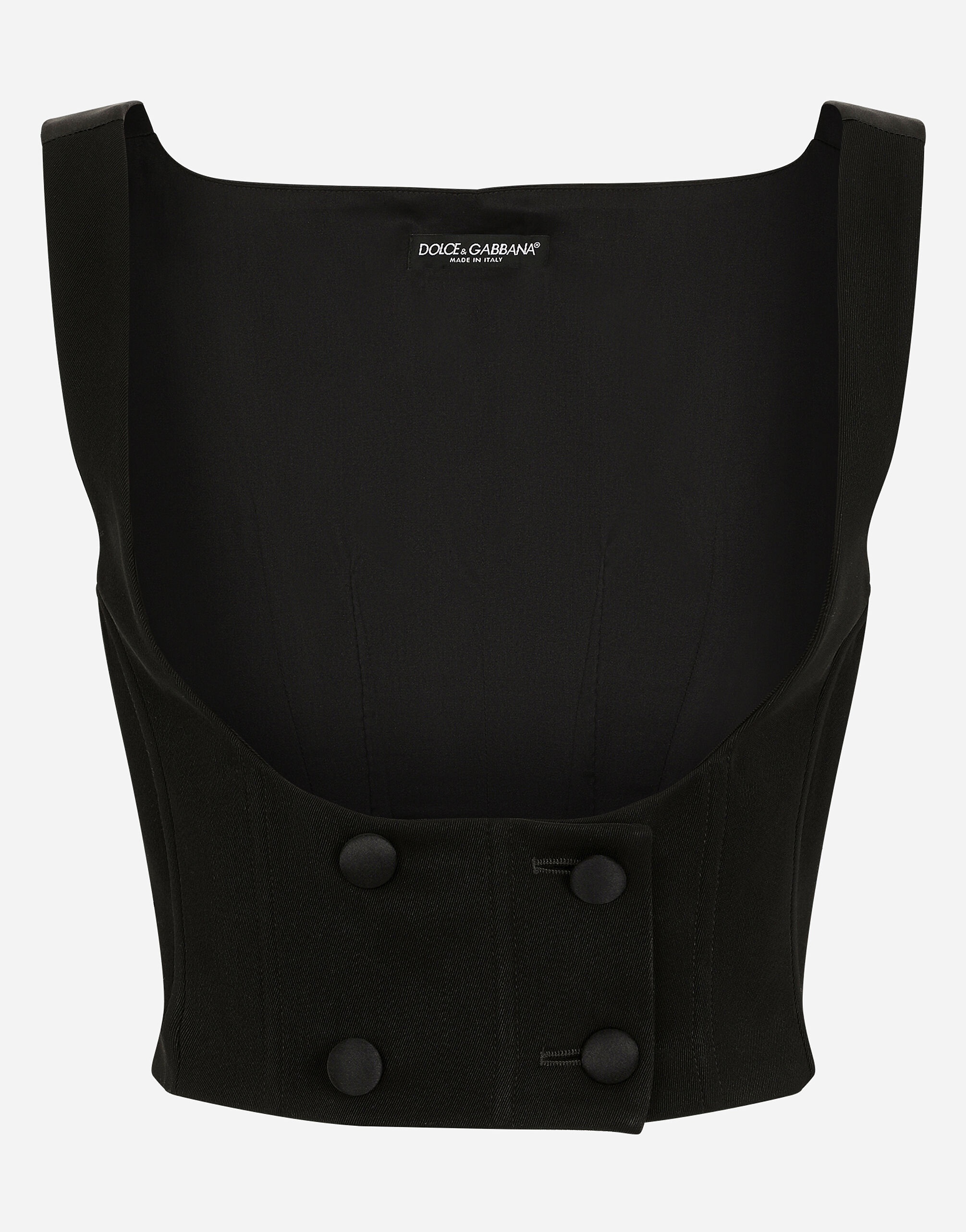 In the “WOMAN SS 24” Collection, the imagery of old Sicily interacts with the masculine, with sensual shapes, lace, nude tones and delicate overlays, to create pieces that move amid clean silhouettes, the elegance of the 1960s, the contrasts of black and white and luxurious textures. The designers are reworking their signature style and their iconic Sicilia black color to convey an aware, seductive and confident Sicilian WOMAN who is imbued with sensuality. Double-breasted wool waistcoat with round neck: • Black • Round neck • Sleeveless • Form fitting • Silk satin lining • Button fastenings • The model is 175 cm tall and wears a size IT 40 • Made in Italy External composition: 60% Virgin Wool 37% Silk 03% Spandex Internal composition: 92% Silk 08% Spandex