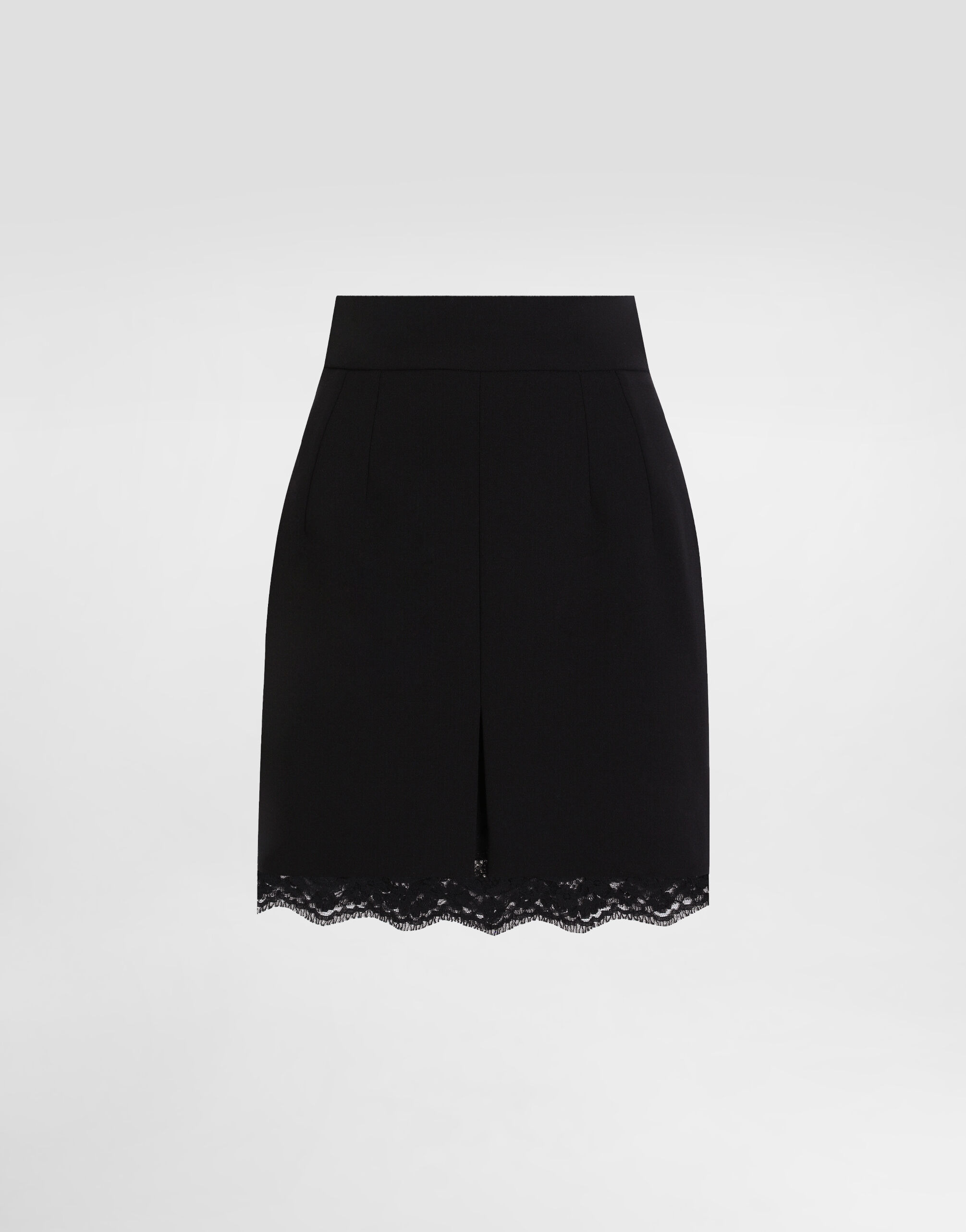 This skirt expresses a bold and sophisticated femininity thanks to its refined design and elegant details. Perfect for those who love a distinctive and refined style, it adapts to different occasions, from casual chic to formal, with a touch of glamour. Skirt in double wool crepe: • Black • Exposed lace from the bottom • Kissed slit at the center front • Covered zip at the center back • Lined • The model is 175 cm tall and wears size 40 IT • Made in Italy External Composition: 100% Virgin Wool Internal Composition: 83% Silk, 7% Cotton, 7% Elastane, 3% Polyamide