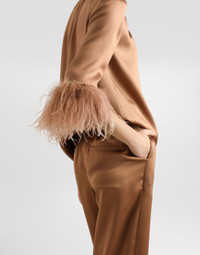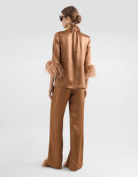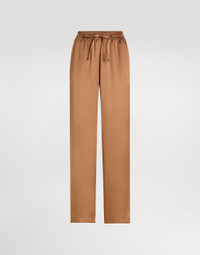 The Everyday Women's Collection reimagines contemporary daily wear with Dolce&Gabbana's signature style codes. Iconic fabrics mix with standout details like embroidered flowers, crystals, and jewel buttons, infusing elegance into every look. Gray animal print accented with green and purple, hyper-geometric jewelry, voluminous shapes and transparencies add unique touches. Men's tweed is reinvented with graphic twists, creating distinctive pieces that reflect refined sensuality. Double silk satin pajama pants: • Brown • High stretch waist with drawstring • In-seam side pockets • Inner leg: 88 cm • Hem: 28 cm • The model is 175 cm tall and wears a size IT 40 • Made in Italy External composition: 100% Silk