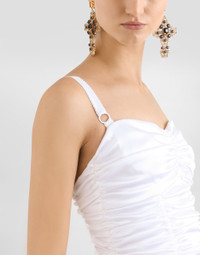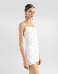 The Spring/Summer 2025 Women’s Collection is celebrating Italian beauty through bold and charismatic femininity. The 50s-inspired lingerie is the star, intermingling with fitted dresses, corsets and oversize trench coats. The iconic jackets have been updated with cropped cuts and modern inserts, while the floral prints add a romantic edge. The eveningwear shines with light fabrics and crystals, accompanied by look-defining accessories, from iconic bags to the cross earrings. Stretch satin draped mini dress: • White • Sweetheart neckline • Padded underwired cups • Sleeveless with adjustable stretch straps • Boned bodice • Stretch silk satin lining • Rear zipper and hook-and-bar fastening • The piece measures 40 cm from the waist down on a size IT 40 • The model is 175 cm tall and wears a size IT 40 • Made in Italy External composition: 63% Acetate 28% Polyamide 05% Silk 04% Spandex Internal composition: 92% Silk 08% Spandex