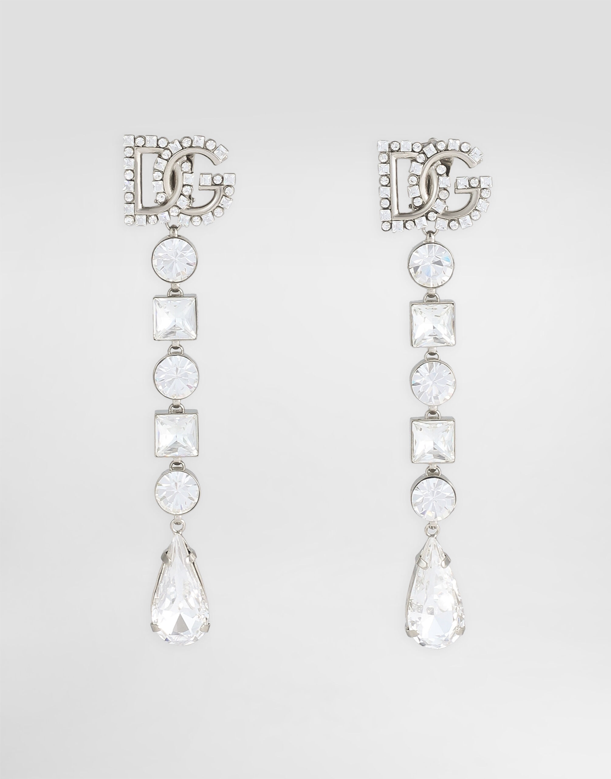 The Everyday Women's Collection reimagines contemporary daily wear with Dolce&Gabbana's signature style codes. Iconic fabrics mix with standout details like embroidered flowers, crystals, and jewel buttons, infusing elegance into every look. Gray animal print accented with green and purple, hyper-geometric jewelry, voluminous shapes and transparencies add unique touches. Men's tweed is reinvented with graphic twists, creating distinctive pieces that reflect refined sensuality. Long rhinestone drop earrings with the DG logo: • Silver • Height: 10 cm • Width: 2 cm • Clip-on fastening • Nickel-free and hypoallergenic materials • Engraved logo • Made in Italy Composition: 70% Brass 30% Glass