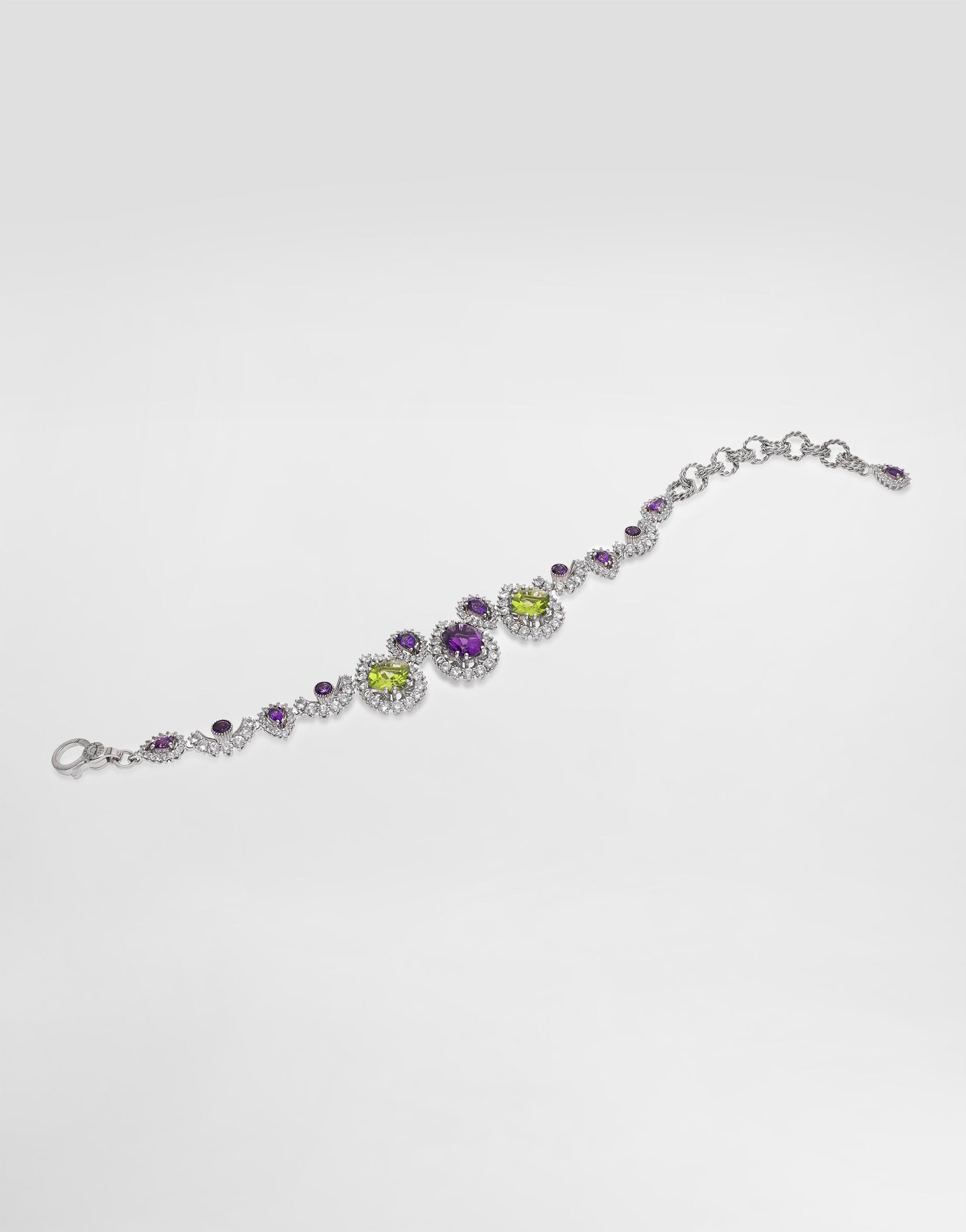 An elegant bracelet made of 18 Kt white gold, embellished with amethysts, peridots, and colorless sapphires. The sophisticated design and the color combination of the gems make this bracelet a jewel of uniqueness and refinement. On the back, a tag with the Dolce&Gabbana logo adds a distinctive touch, a seal of authenticity and style. Gemological Details: 2 peridots: green-yellow color, square cushion shape, mixed cut; 1 amethyst: purple color, oval shape, mixed cut; 7 amethysts: purple color, drop shape, mixed cut; 4 amethysts: purple color, round shape, mixed cut; 192 sapphires: colorless, round shape, brilliant cut. Made in Italy 750/000 white gold