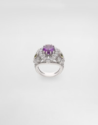 Elegant ring made of white gold, embellished with a central amethyst, with intense shades, framed by bright peridots and colorless sapphires that enhance its brilliance and refined design. On the back, a tag with the Dolce&Gabbana logo adds a distinctive touch, a seal of authenticity and style. Gemological Details: 1 amethyst: purple color, oval shape, mixed cut; 2 peridots: green-yellow color, round shape, mixed cut; 40 sapphires: colorless, round shape, brilliant cut. Made in Italy 750/000 white gold