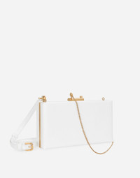 Versatile and sophisticated, the new Eva bag comes in calfskin. Featuring a snap closure, it has a decorative chain with a branded padlock and a double strap so it can be carried over the shoulder and across the body. Calfskin Eva Box bag: • White • Removable and adjustable calfskin strap with branded snap-hooks • Calfskin shoulder pad with branded snap-hooks • Vintage brass snap fastening • Nappa leather lining, bellow pocket, four card slots and elastic storage strap. • Item comes with a branded dust bag • Measurements: H11.5 x W22 x D4.5 cm • Made in Italy External composition: 100% Calfskin Internal composition: 96% Lambskin 4% Viscose
