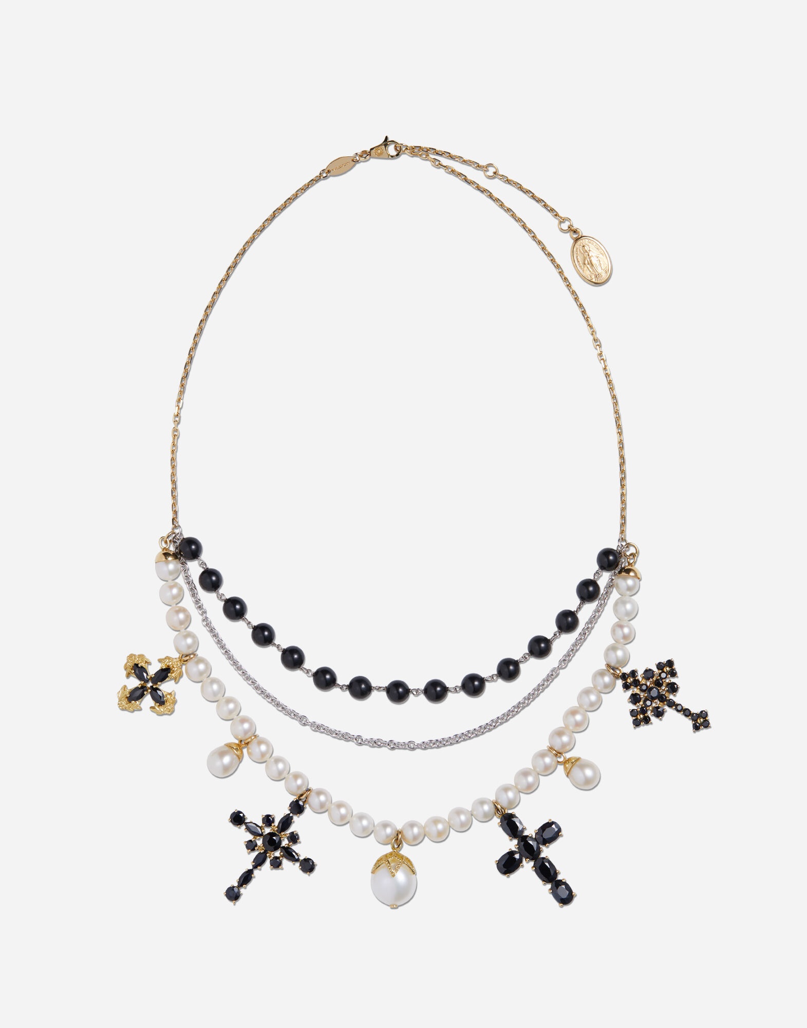Necklace formed of a main chain in yellow gold from that winds into three different strands. one made with fifteen hand joined black jade beads, a white gold "belcher" chain and a chain consisting of thirty freshwater pearls. This final element has been embellished by four pendants in the shape of a cross, made with round, oval and marquise black sapphires, and three pendants with drop pearls. An additional medallion featuring the Virgin Mary with the "DOLCE&GABBANA" logo on the back has been added to the end of the adjustable chain. Technical specifications. • Gold 18 Kt • Length. 40 + 5 cm adjustable. • Gemstones. 52 round, marquise and oval black sapphires, 15 black jade spheres, 30 spherical freshwater pearls, 3 freshwater drop pearls Yellow and white 18 kt Gold