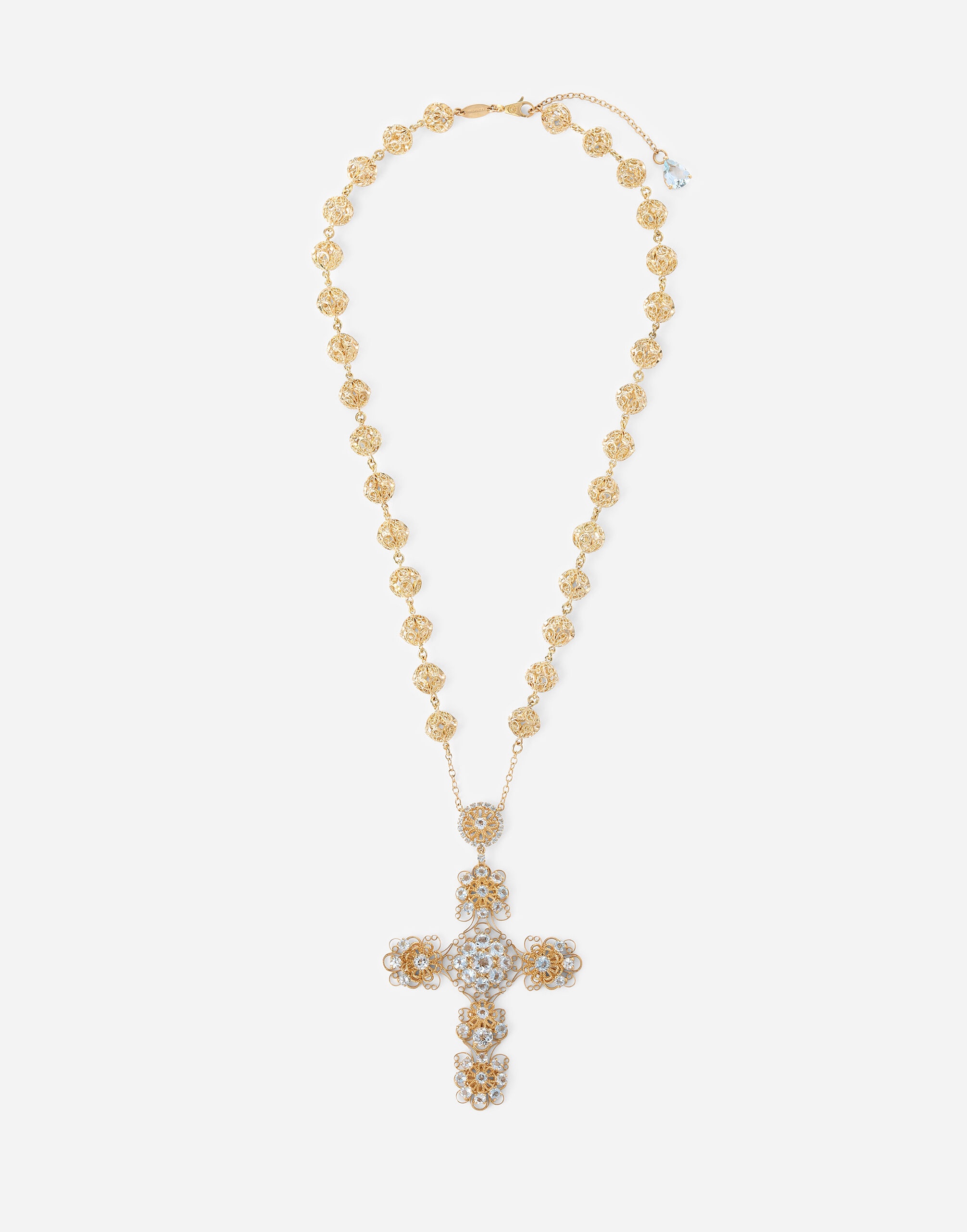 The filigree necklace consists of a chain with spheres connected by a handmade link and a pendant cross characterized by wire work with floral motifs in twisted wire, further enriched by round aquamarines. Another floral motif in twisted wire with aquamarines connects the cross to the necklace. A teardrop aquamarine has been inserted as a terminal in the adjustment chain while an oval tag bearing the DOLCE&GABBANA logo is placed before the closure. Technical features: Gold 750/000. Length: 45 + 5 cm adjustable. Gems: 60 round and drop-shaped aquamarines. Made in Italy. Yellow gold 750/000