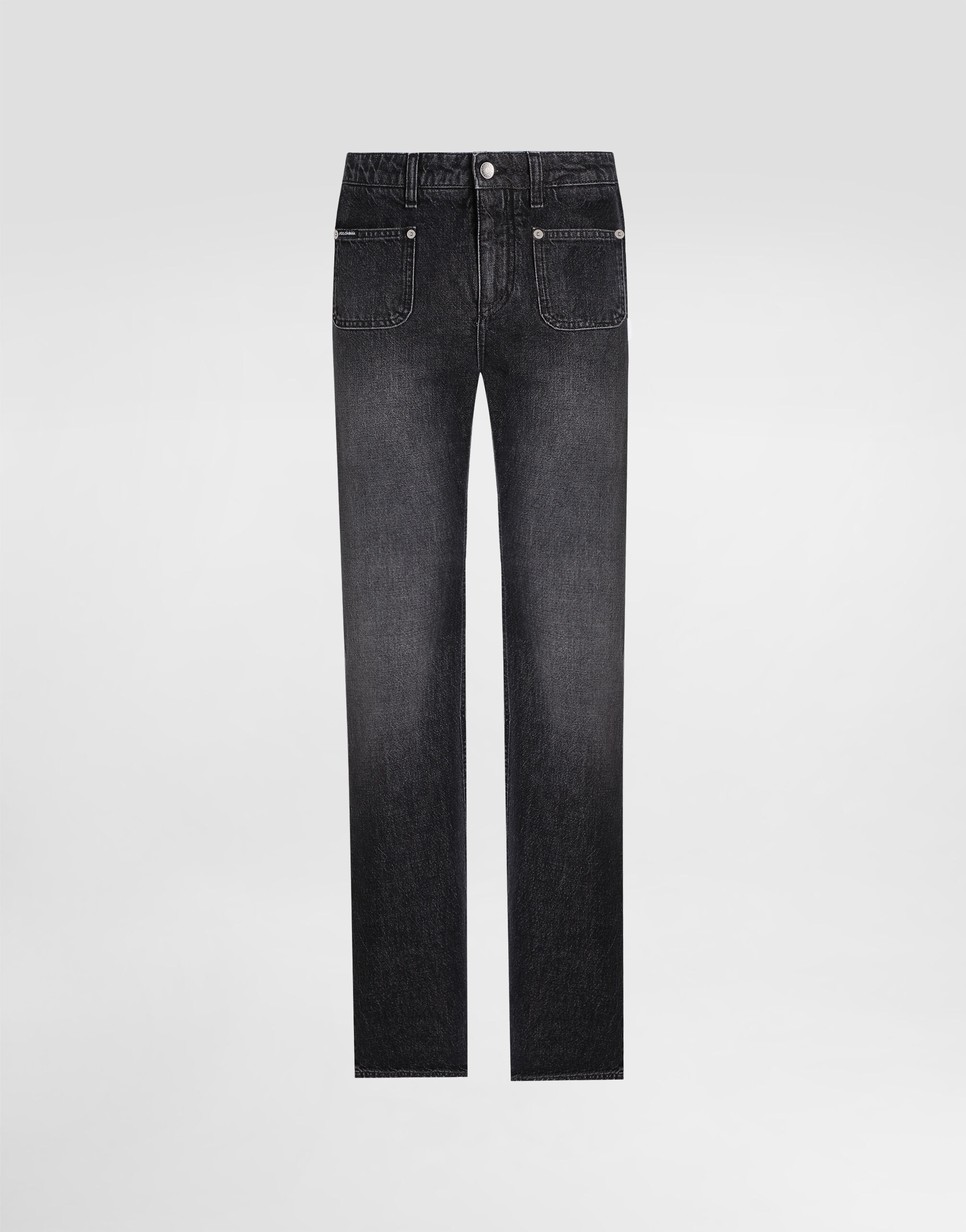 Dolce&Gabbana is conveying a new way of interpreting denim and does so by drawing inspiration from key words such as glamor and signature aesthetic, creating a collection that is perfect for every style and personality, merging femininity, modernity and originality. Flared denim jeans: • Black • Low rise • Front patch pockets • Branded label on the coin pocket • Branded metal and leather tag on the back pocket • Inner leg: 81.5 cm • Hem: 23 cm • Zipper and branded metal button fastening • The model is 175 cm tall and wears a size IT 40 • Made in Italy External composition: 100% Cotton