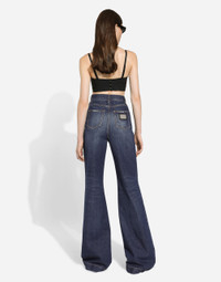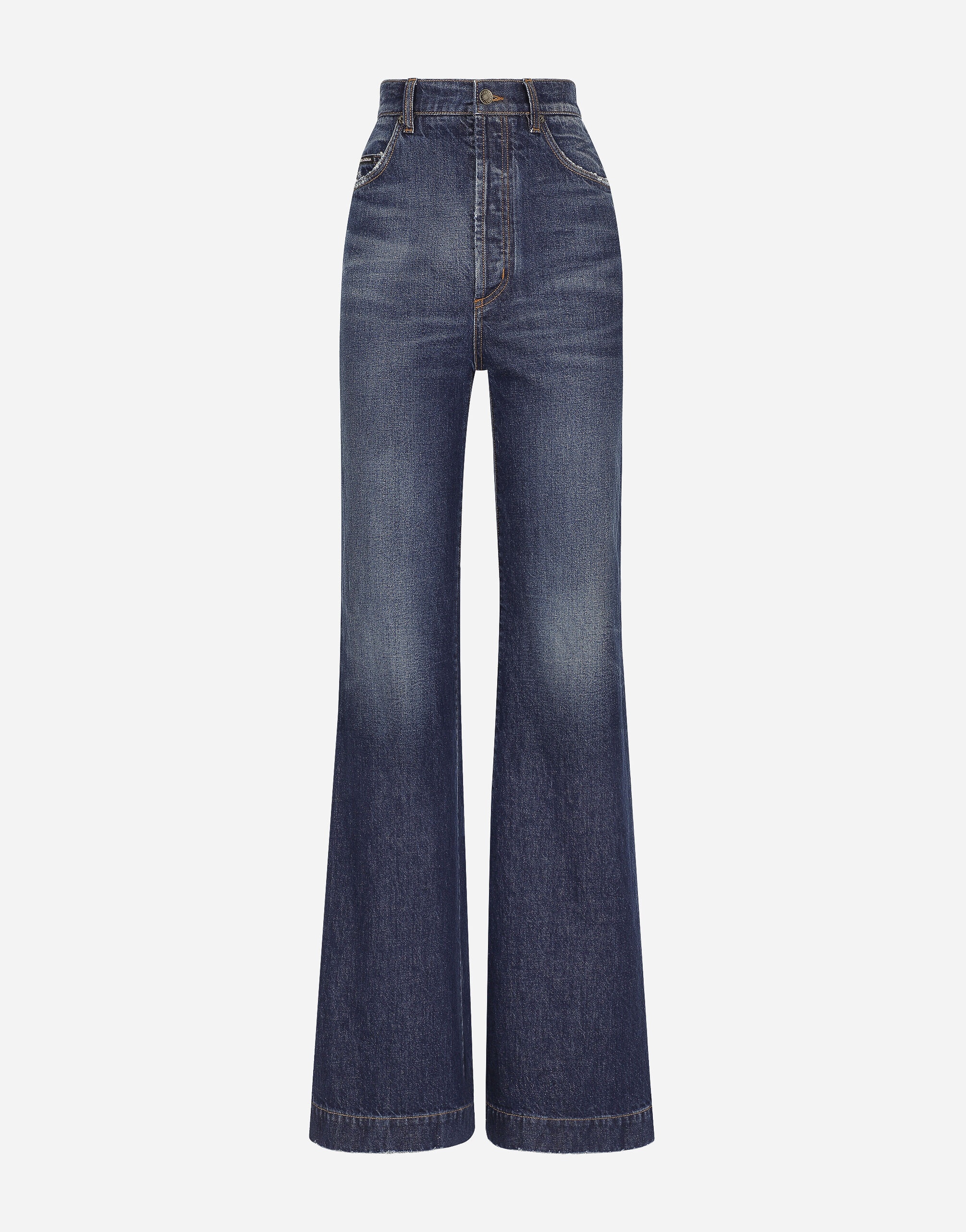 The spirit of the 1960s is taking over the new Flower Power collection. The focus is a head-to-toe floral look built around pairing and layering rose, anemone and floral bouquet maxi-prints. A cosmopolite poised between playful and sexy, this woman interprets the austerity and elegance of the 1960s, harking back to boldly opulent imagery that here at Dolce&Gabbana is condensed and reinterpreted through silhouettes, ample proportions and airy shapes, bringing femininity and sensuality to the forefront. Flared cotton denim jeans: • Blue • Low rise • 5 pockets • Branded metal and leather tag • Branded label on the coin pocket • Inner leg: 90 cm • Hem: 30 cm • Zipper and branded metal button fastening • The model is 175 cm tall and wears a size IT 40 • Made in Italy External composition: 100% Cotton
