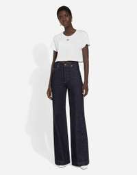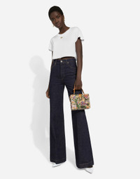 The spirit of the 1960s is taking over the new Flower Power collection. The focus is a head-to-toe floral look built around pairing and layering rose, anemone and floral bouquet maxi-prints. A cosmopolite poised between playful and sexy, this woman interprets the austerity and elegance of the 1960s, harking back to boldly opulent imagery that here at Dolce&Gabbana is condensed and reinterpreted through silhouettes, ample proportions and airy shapes, bringing femininity and sensuality to the forefront. Flared cotton denim jeans: • Blue • High-waisted • 5 pockets • Branded metal and leather tag • Branded label on the coin pocket • Inner leg: 90 cm • Hem: 29.5 cm • Zipper and branded metal button fastening • The model is 175 cm tall and wears a size IT 40 • Made in Italy External composition: 100% Cotton