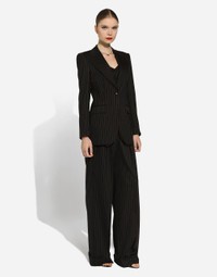 In the Black Sicily Collection, black, the absolute protagonist, becomes sensual black, sheer black, Dolce&Gabbana black. The key concept is “Black on Black”. Playing around with proportions, volumes, layered fabrics and sheer details, this style becomes absolute, bold and sexy. Unique and unmistakable, it is conveyed through the contrasts between glossy and matte fabrics, lines, volumes and special details, thereby expressing a woman’s various personalities and the true identity of Dolce&Gabbana. Flared pinstripe stretch wool pants: • Black • Regular rise • Front slant pockets • Welt back pockets with buttons • Belt loops • Inner leg: 90 cm • Hem: 30 cm • Concealed front zipper and covered button fastening • The model is 175 cm tall and wears a size IT 40 • Made in Italy External composition: 96% Virgin Wool 2% Spandex 2% Polyester