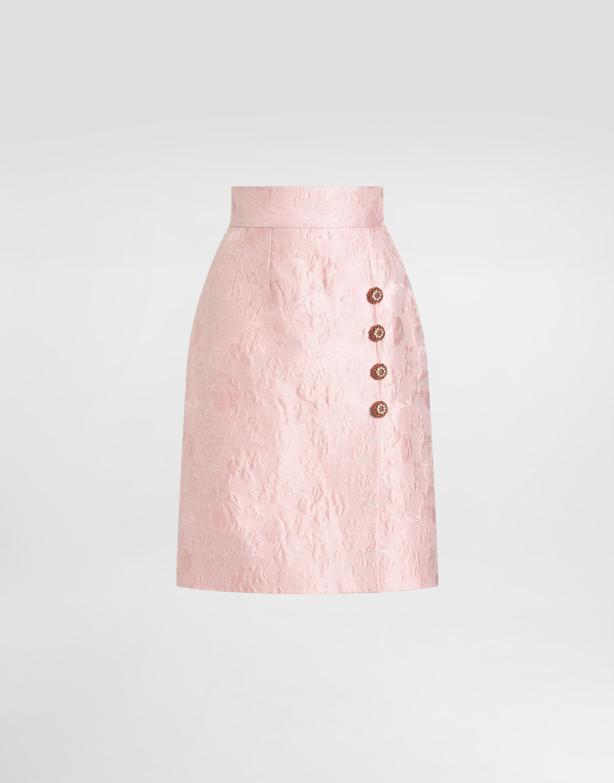 This floral jacquard skirt is an essential piece for those who love a feminine and sophisticated look. The wrap design and silk and cotton workmanship add a touch of elegance to any outfit. Floral jacquard skirt: • Pink • A-line • Wrap cut • Covered zip at the center back • Lined • The model is 175 cm tall and wears size 40 IT • Made in Italy External Composition: 44% Cotton, 32% Polyester, 24% Silk Internal Composition: 92% Silk, 8% Elastane