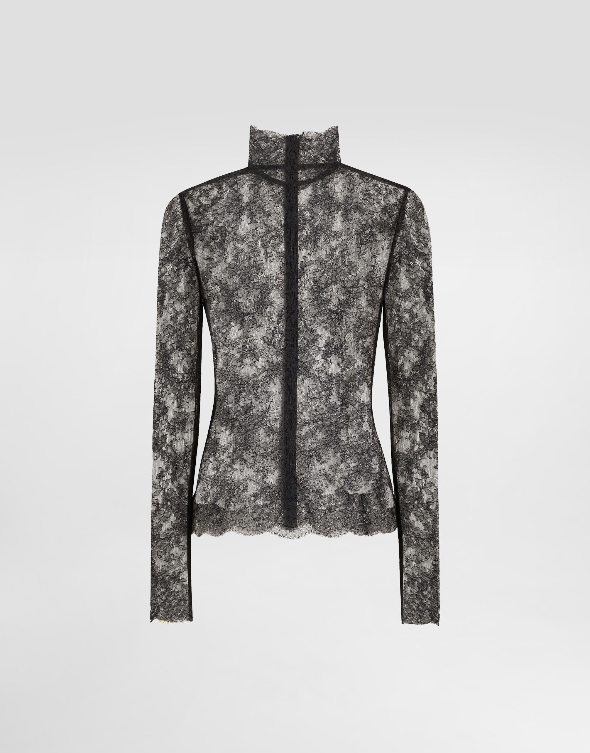 The Everyday Women's Collection reimagines contemporary daily wear with Dolce&Gabbana's signature style codes. Iconic fabrics mix with standout details like embroidered flowers, crystals, and jewel buttons, infusing elegance into every look. Gray animal print accented with green and purple, hyper-geometric jewelry, voluminous shapes and transparencies add unique touches. Men's tweed is reinvented with graphic twists, creating distinctive pieces that reflect refined sensuality. Floral lace turtle-neck top: • Black • High neck • Long sleeves • Fitted waist • Unlined • Zipper fastening at the back • The piece measures 60 cm from the center back on a size IT 40 • The model is 175 cm tall and wears a size IT 40 • Made in Italy External composition: 71% Polyester 29% Viscose