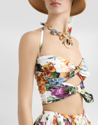 This printed poplin top is the epitome of modern elegance, featuring draped details and an eye-catching silhouette, perfect for those looking for a distinctive and fashionable look. Poplin top with flower bouquet print: • Multi-coloured • Halter lacing • Bows on the front • Knotted straps at the back • Zip at the back • The model is 175 cm tall and wears size 40 IT • Made in Italy The difference in the print placement that you may find on this product is a feature of Dolce&Gabbana’s “Handmade” pieces. A detail that makes every garment or accessory unique and exclusive. External Composition: 100% Cotton Internal Composition: 97% Cotton, 3% Elastane