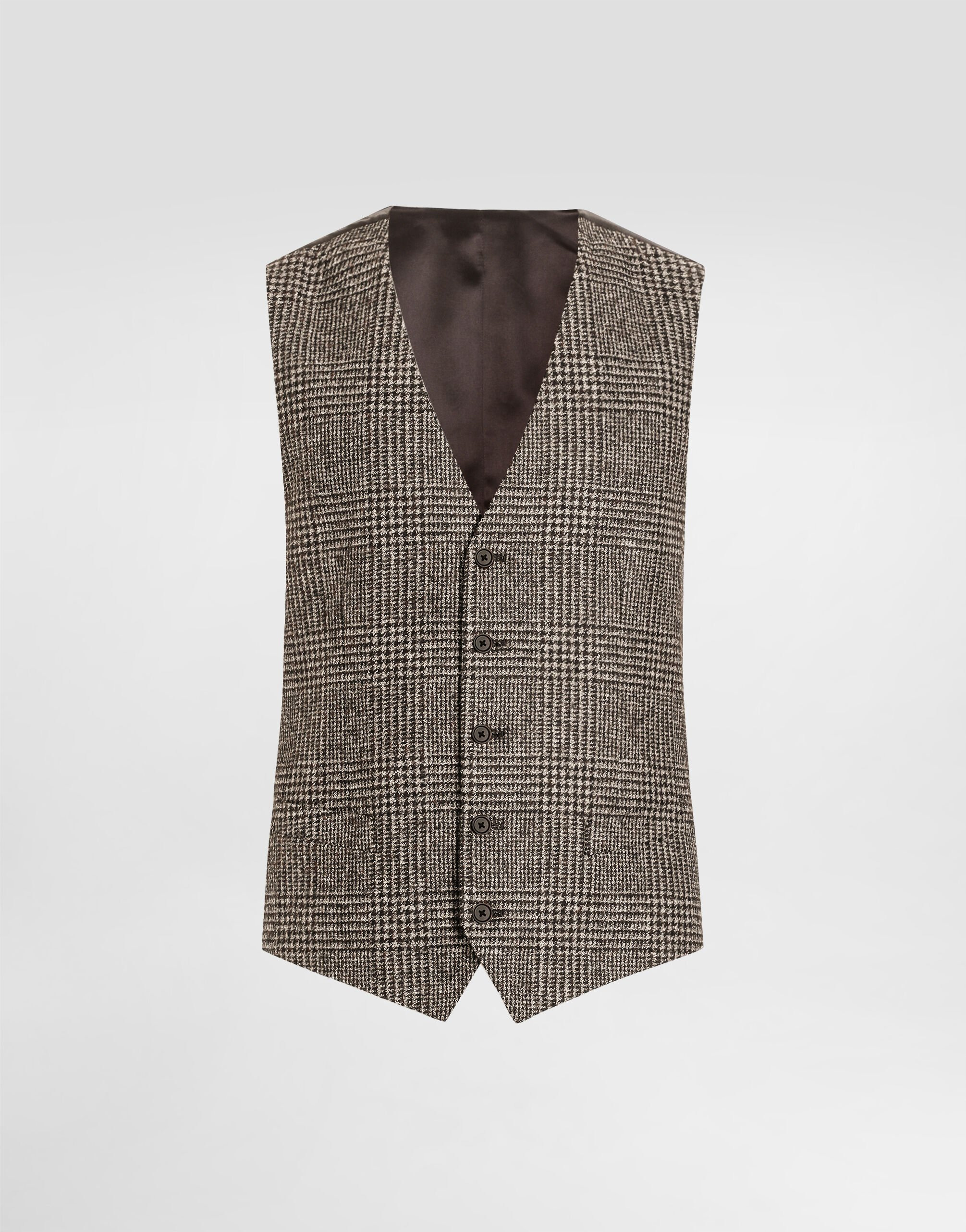 The scene is set for Dolce&Gabbana's distinctive and iconic aesthetic codes in the Collection from Men's Fall/Winter 2025 Fashion Show. The evening lights up with radiant brooches and is enriched with classic suits and blazers of timeless elegance. This single-breasted glen plaid alpaca blend vest is an elegant and versatile garment, perfect for completing a formal look with a touch of sophisticated style. Glen plaid vest: • Multi-colored • No lapel • Single-breasted with buttons • Welt pocket • Lined • The model is 185 cm tall and wears a size 48 IT • Made in Italy External Composition: 37% Silk, 20% Alpaca, 17% Cotton, 15% Wool, 11% Polyamide