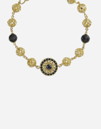 This bracelet is composed of round faceted black jades, spheres of gold filigree – an ancient technique still practised in Liguria – and a rosette modelled in the round and embellished by black sapphires. The chromatic contrast between the yellow of the gold and the black of the gemstones accentuates both the refined elegance of the metalwork and the preciousness of the materials. • Gold 18 Kt. • Length. 19 + 5 cm adjustable. • Gemstones. 4 black jade beads, 38 round black sapphires • Made in Italy Material: Yellow 18 kt Gold