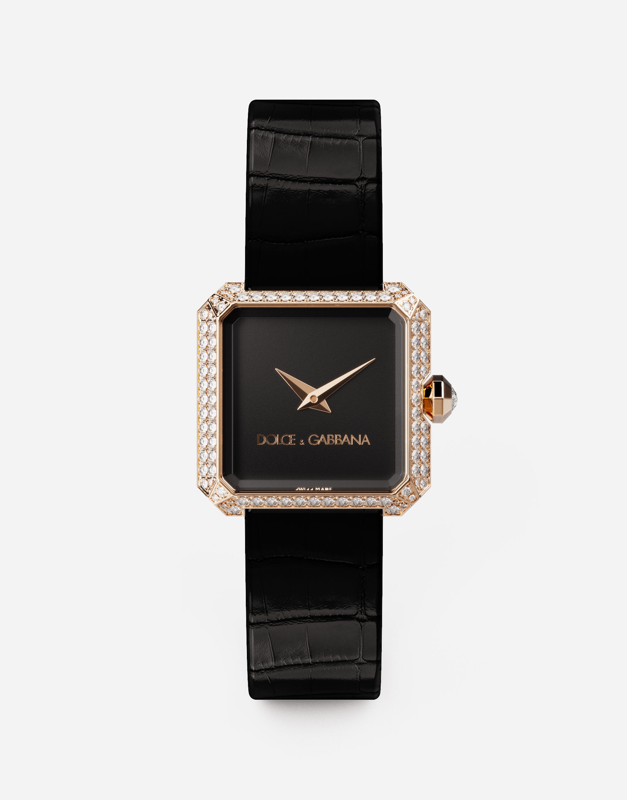 Watch from the SOFIA line with black alligator strap. • Material. 18 Kt pink gold - Size. 24 x 24 mm - Glass. “sapphire” glass with geometrical facets - Crown. 18 Kt pink gold set with 1 rose cut diamond • Gemstones. 91 colourless diamonds 0.62 ct approximately, quality range. colour D-G, clarity VS-SI. • Water resistance. 3BAR/3ATM • Dial black enamelled, without markers with pink gold plated logo at 6 o’clock • Electronic quartz movement powered by a 1.5 V, 3 years life battery. • Calibre. ETA E01.001 Swiss Made • Size. 11 mm diameter, h 2.5 mm • Frequency of the quartz. 32,768 Hz • Number of rubies. 3 • Strap. black alligator • Clasp. pin buckle in 18 Kt pink gold • Swissmade Add your personal touch to this item such as your initials or a customized message. Send the request to CustomerServiceJewelleryWatches@dolcegabbana.it. If the item has been customized then it cannot be returned. Material: Red 18 kt Gold Indication of hours and minutes Bottom clasp: with four side screws and safety closure Hands: pink gold plated, “sword shaped” POST-SELLING WATCHES MAINTENANCE To maintain the sheen of the watch and metal bracelet, we recommend using mild soap and rinsing thoroughly with warm water. Dry with a soft cloth. We recommend this being done also after a swim in the sea or pool. It is advisable to avoid direct contact with solvents, detergents, perfumes and cosmetic products, which might damage the case, seals, bracelet and/or strap. It is advisable to protect the watch from falls and shocks, which could not only seriously damage the finish, but might affect the mechanical functions also, as well as the water resistance and accuracy of the watch. Temperatures above 60° C and below -10° C , sudden changes in pressure, density and temperature, magnetic fields, and many other factors can affect the accuracy of the watch. If you note any irregularities in operation, the watch should be taken to an authorised Dolce&Gabbana retailer. The Dolce&Gabbana watch is a high-precision timepiece. Despite the care watchmakers have dedicated to making it, the influence of magnetic fields, sudden temperature change and even the lifestyle of the wearer may result in minor irregularities. To ensure optimal operation, it is recommended that a comprehensive inspection be effected every three or four years. The owners of the watch can benefit from a global network of Dolce&Gabbana retailers, which alone are authorised to carry out operations on the watch. In the same way, for the electronic quartz movement, it is recommended that the battery be replaced by an authorised Dolce&Gabbana retailer, which will at the same time check the proper functioning and water resistance of the watch. During maintenance, the battery and any electrical parts are collected and disposed of in accordance with current regulations.