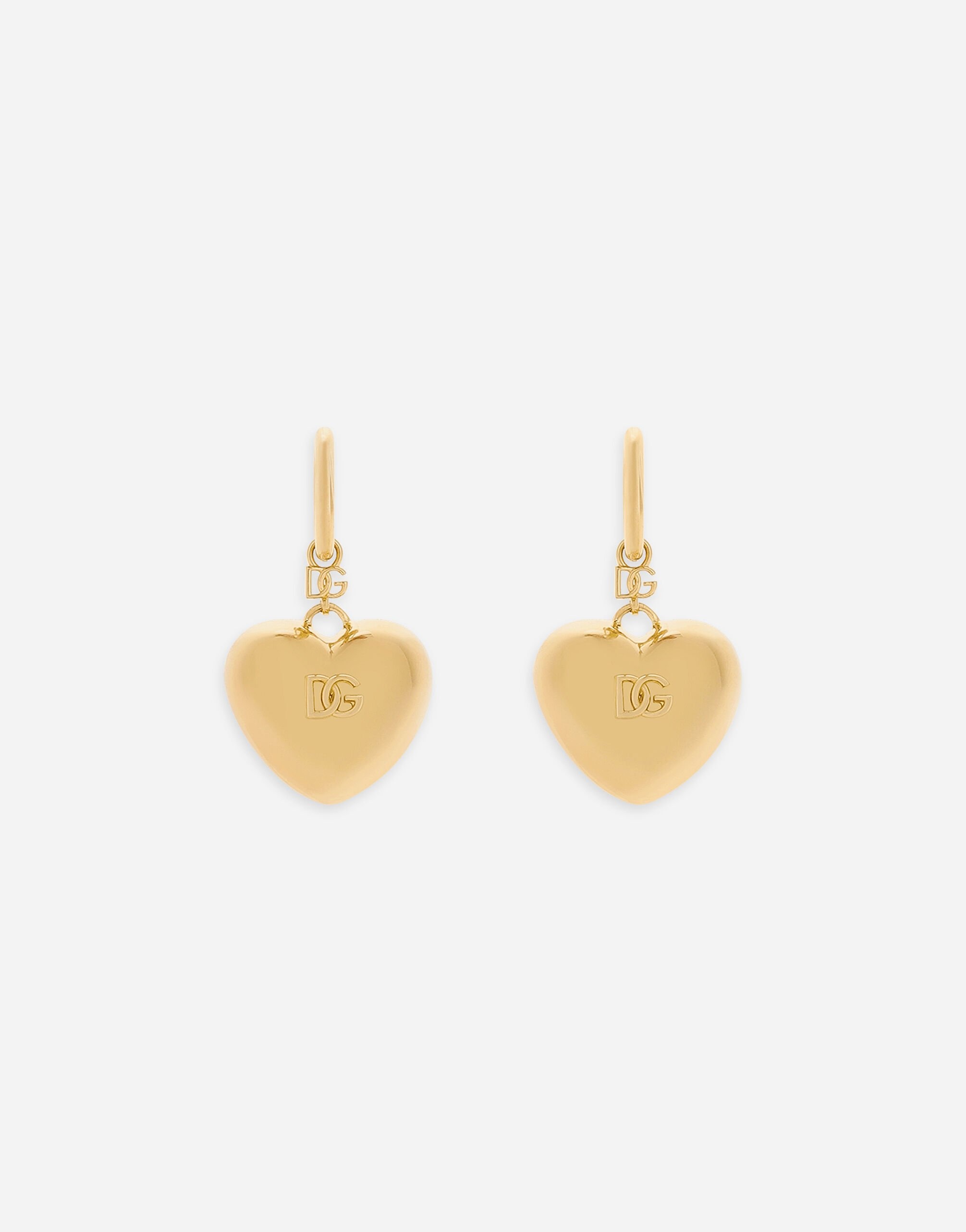 The Dolce&Gabbana Jewelry Collection is filled with unique pieces boasting great craftsmanship. Contemporary accessories with original and exclusive DG logo details, featuring different plated finishes, will be perfect for finishing off any look with great style. Heart drop earrings with DG logo: • Gold • Height: 5 cm • Hoop fastening • Nickel-free and hypoallergenic materials • Engraved logo • Made in Italy Composition: 80% Brass 20% Steel
