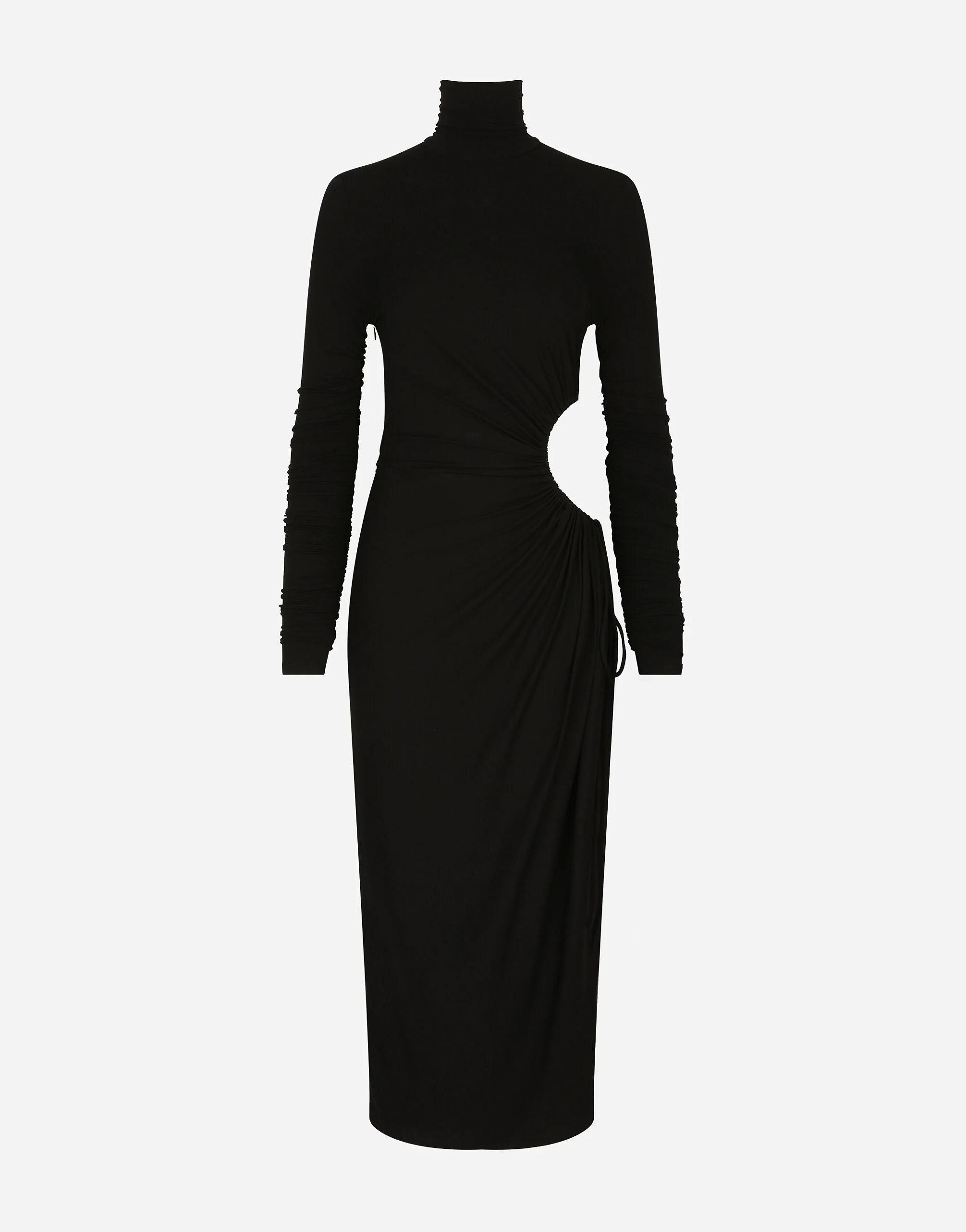 High-necked jersey calf-length dress with cut-out: • Black • High neck • Long sleeves • Unlined • Zipper and hook-and-eye fastening on the side • The piece measures 83 cm from the waist down on a size IT 40 • The model is 175 cm tall and wears a size IT 40 • Made in Italy Care And Details External composition: 92% Viscose 8% Spandex